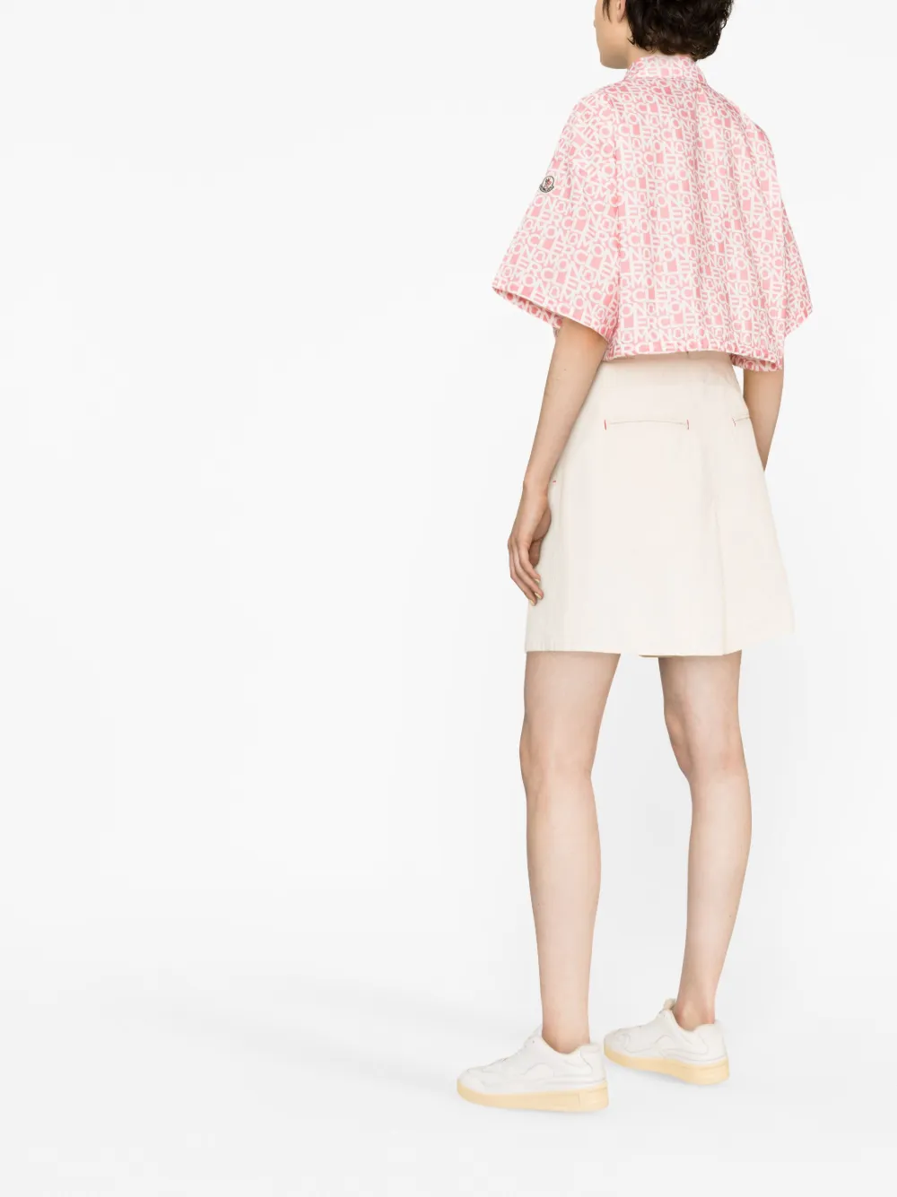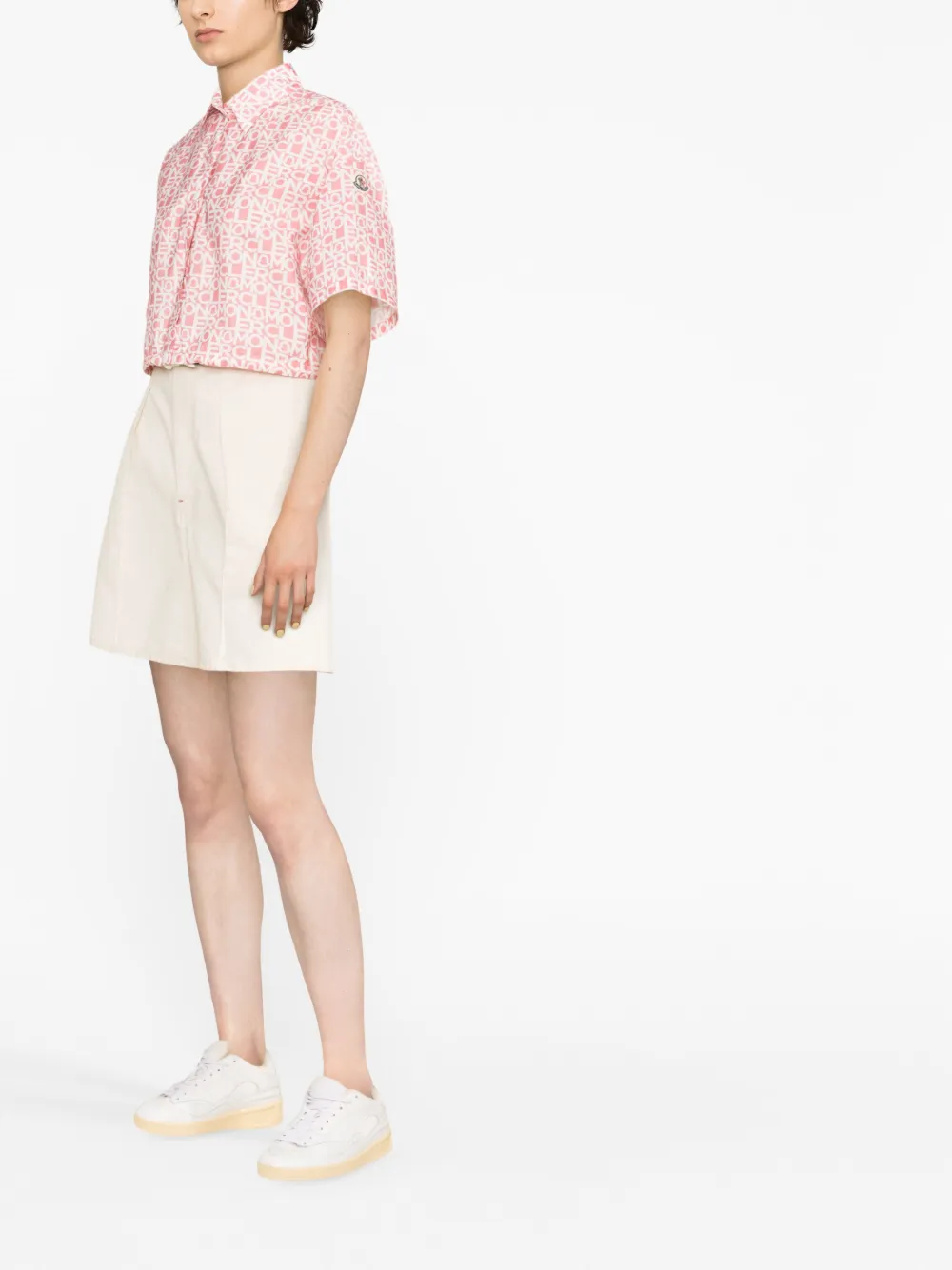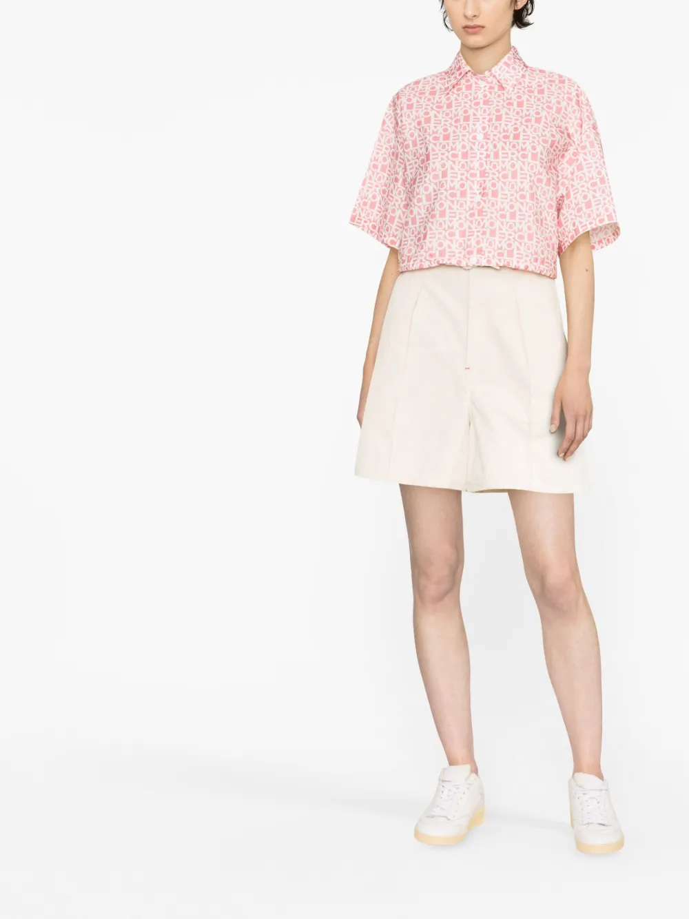Кораллово-розовый, белый, сплошной принт с логотипом, пуговицы с выгравированным логотипом, классический воротник, приспущенные плечи, короткие рукава, застежка на пуговицах спереди, прямой подол и укороченная длина.