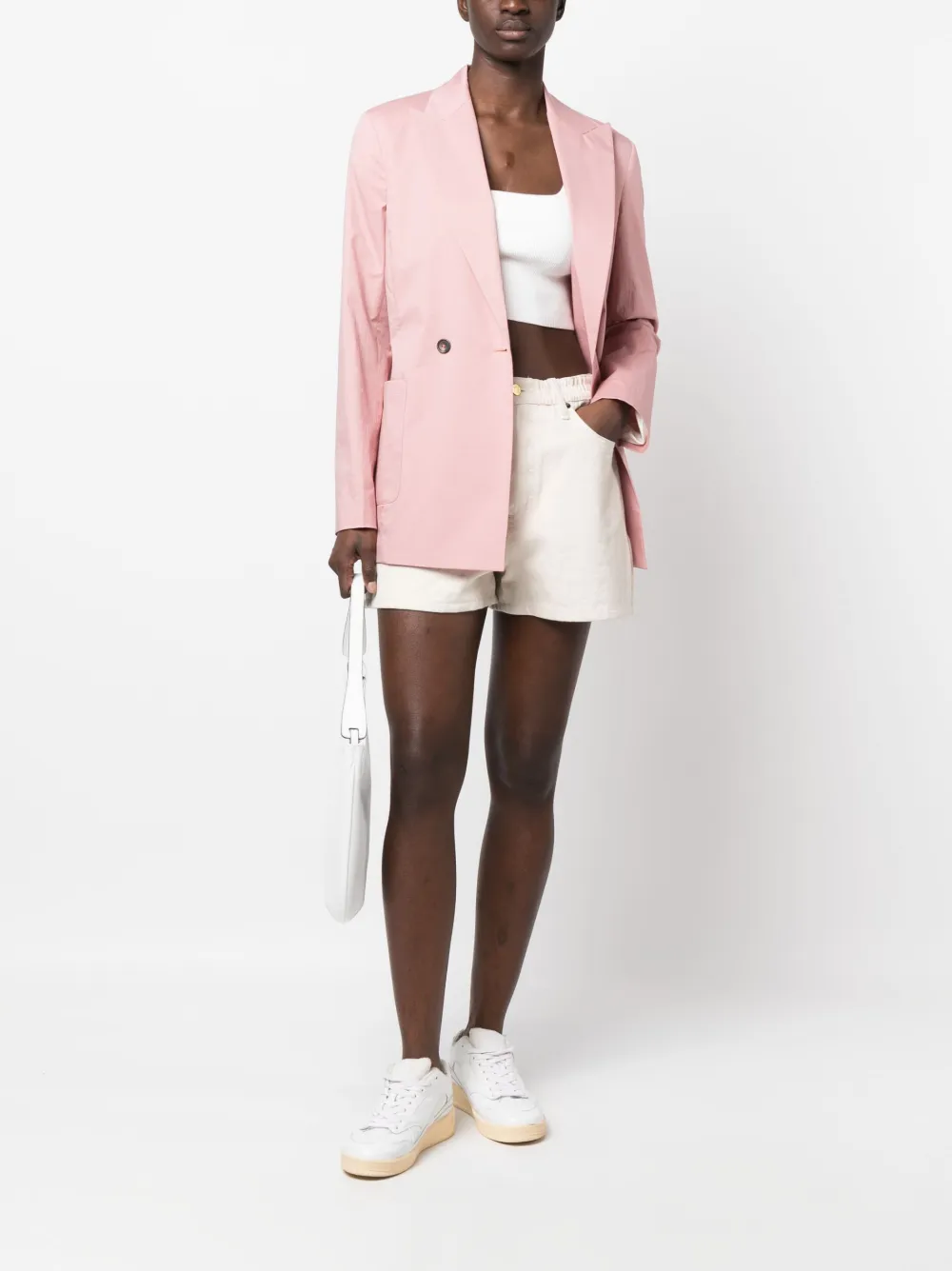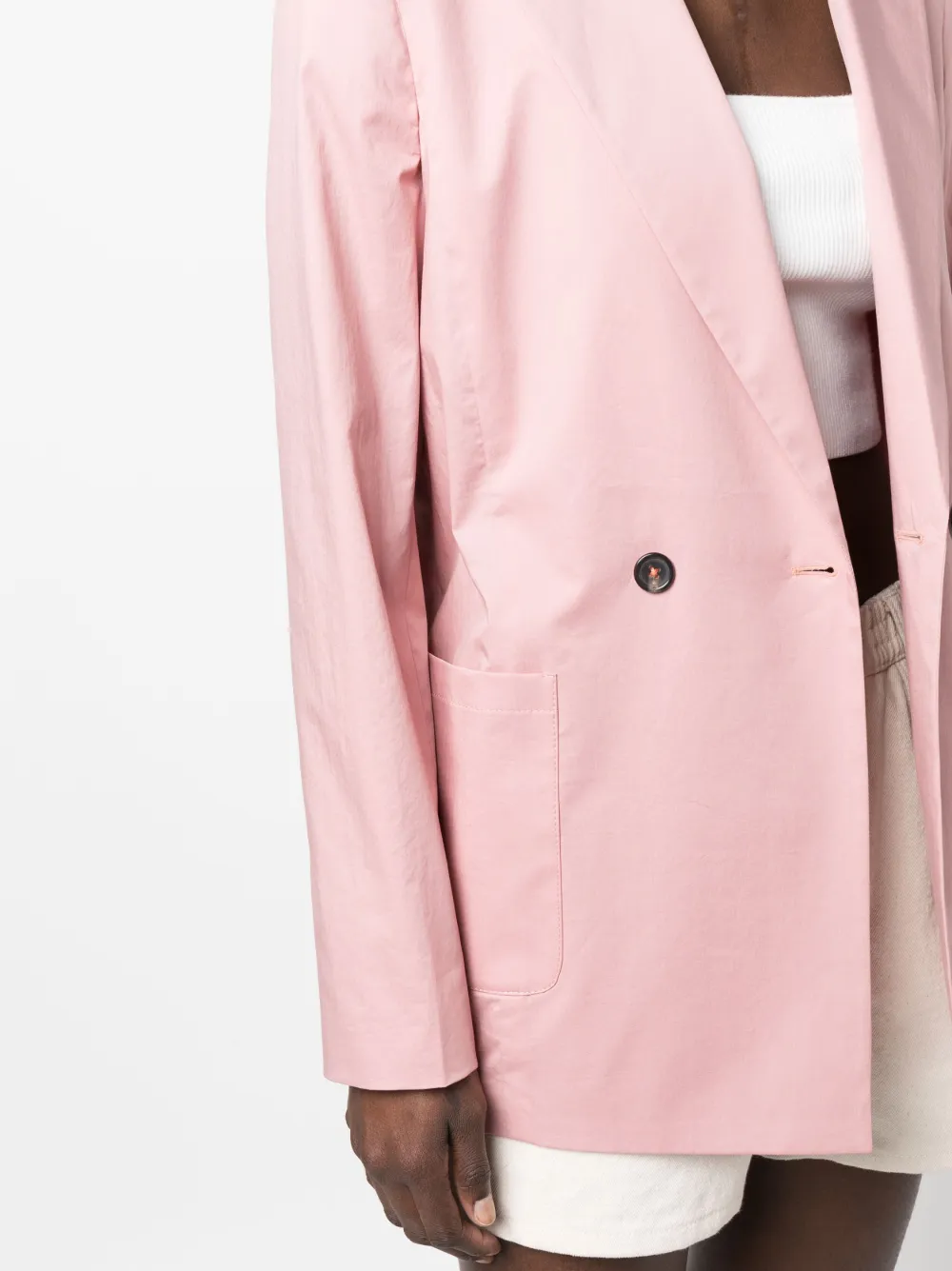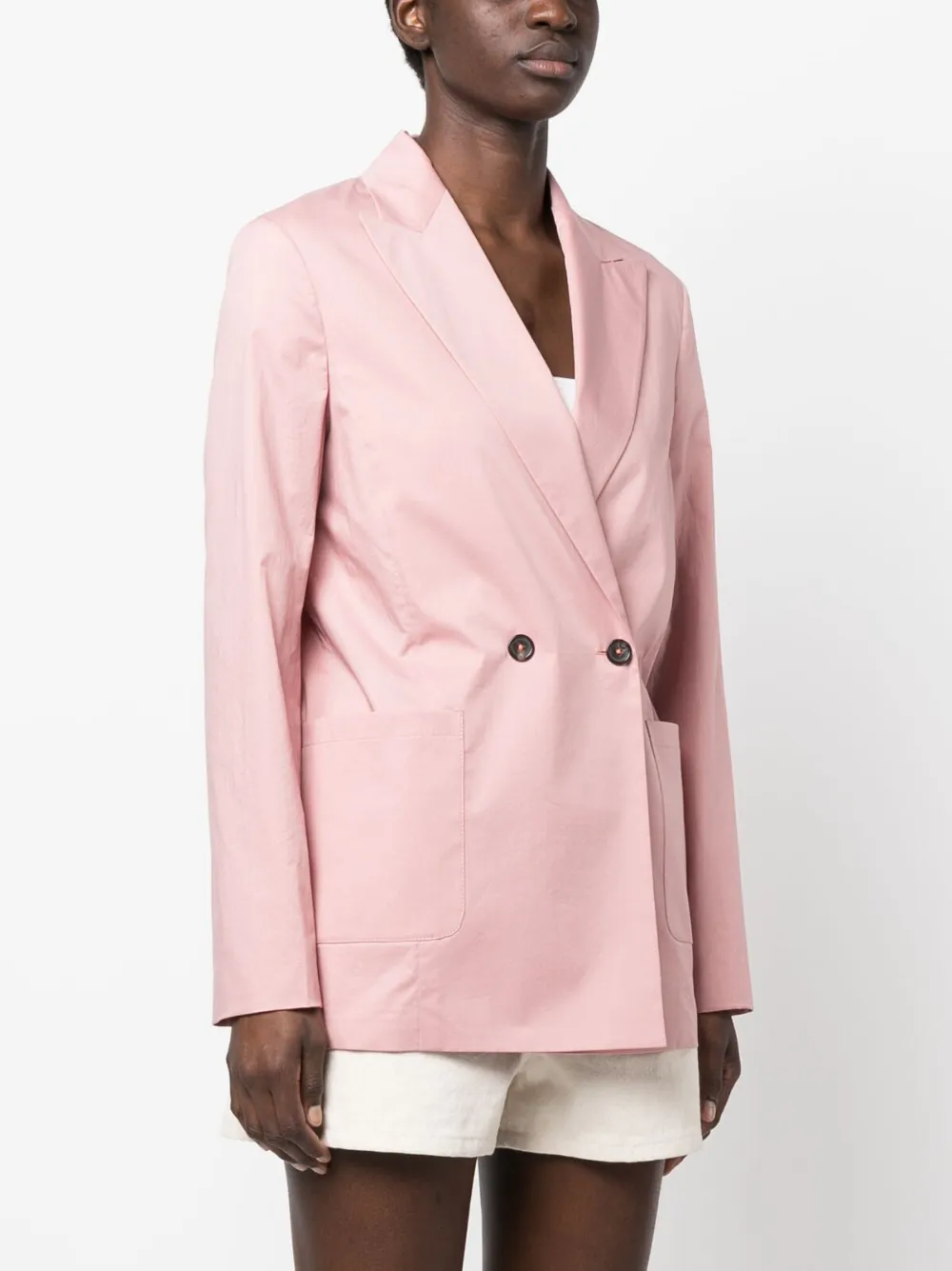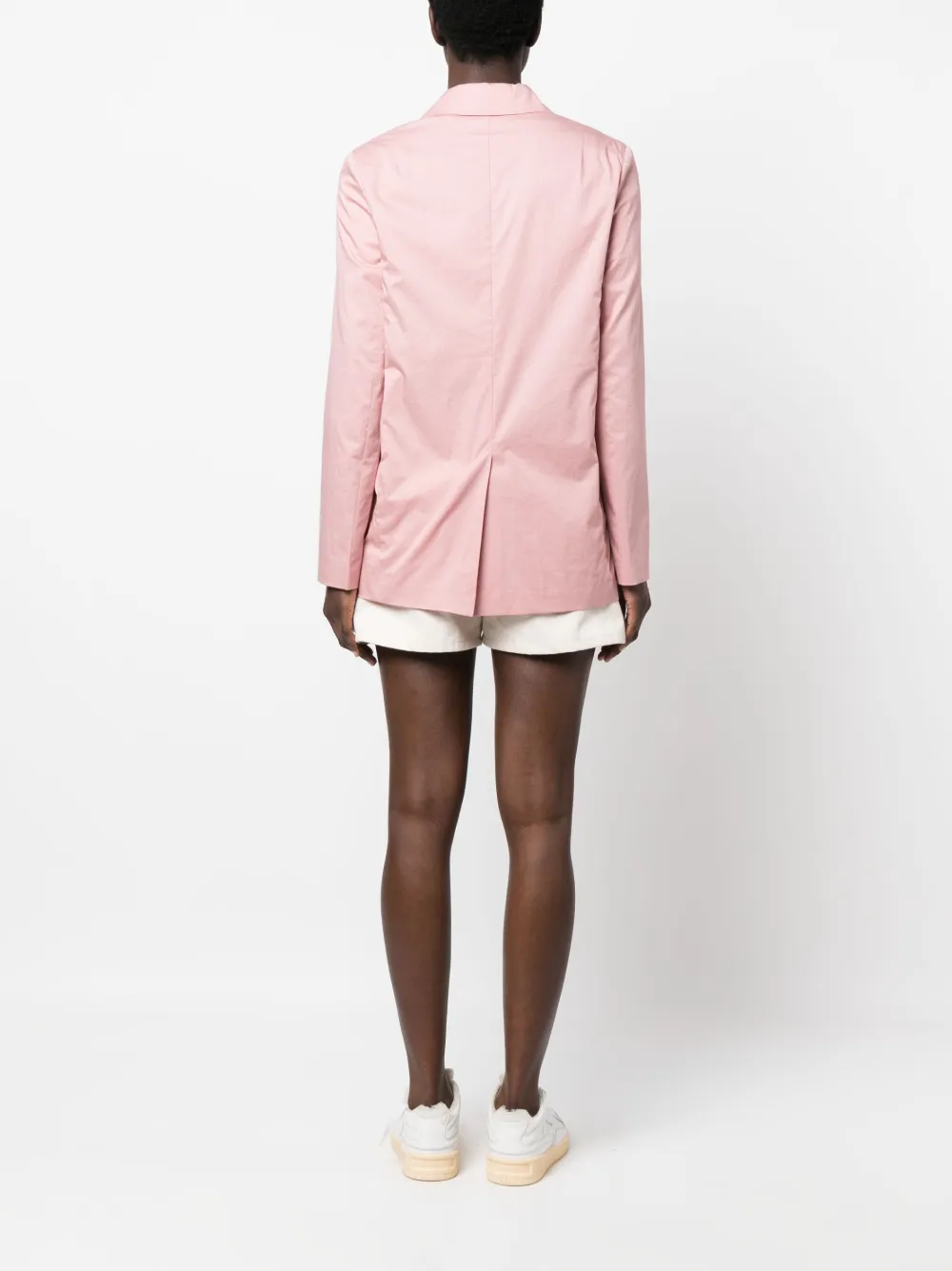 Пудрово-розовый, эластичный хлопок, заостренные лацканы, двубортная застежка на кнопки, два накладных кармана спереди, длинные рукава и шлица по центру сзади.