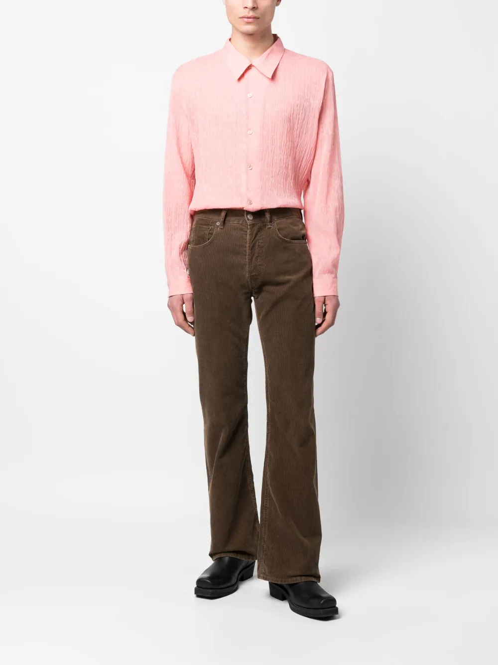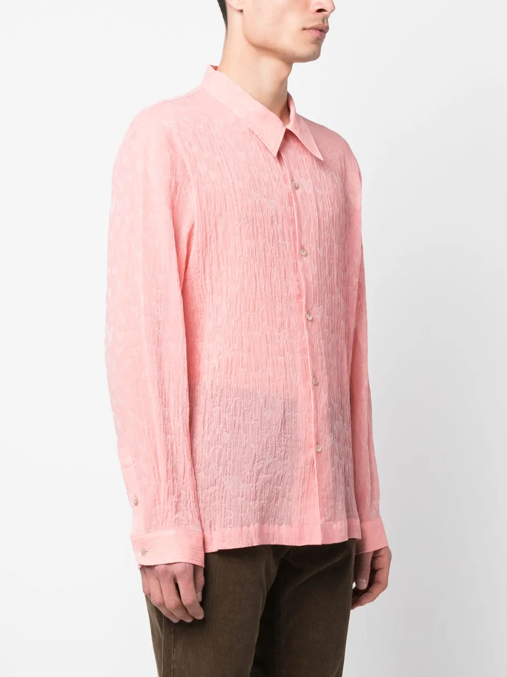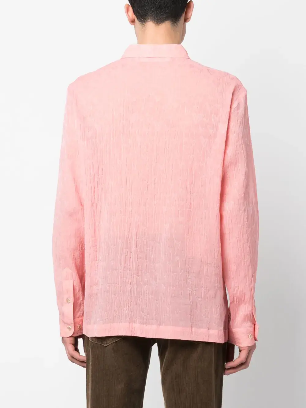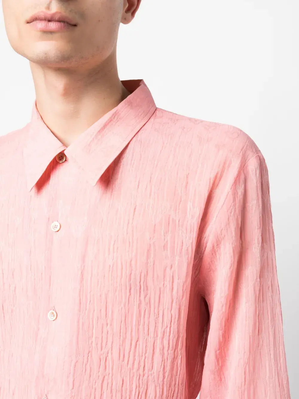 Персиково-розовый, смесь хлопка и шелка, фактурная отделка, плоский заостренный воротник, застежка на пуговицах спереди, длинные рукава, манжеты на пуговицах и прямой подол.