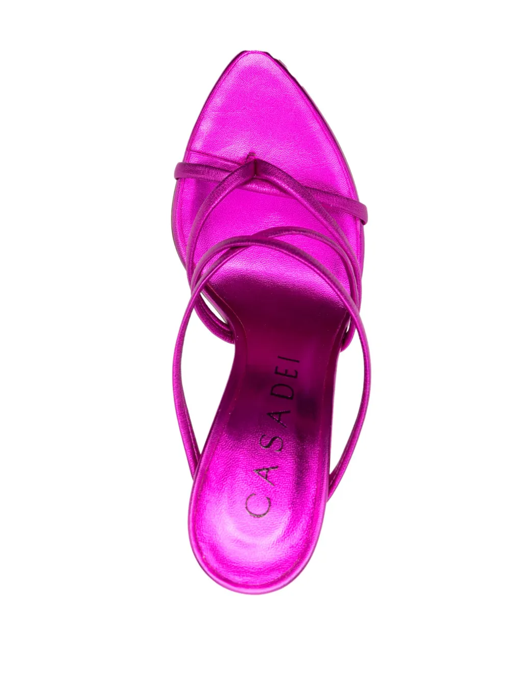 Фуксия, телячья кожа, покрытие с эффектом металлик, открытый носок, ремешки, стелька с логотипом и каблук-шпилька.