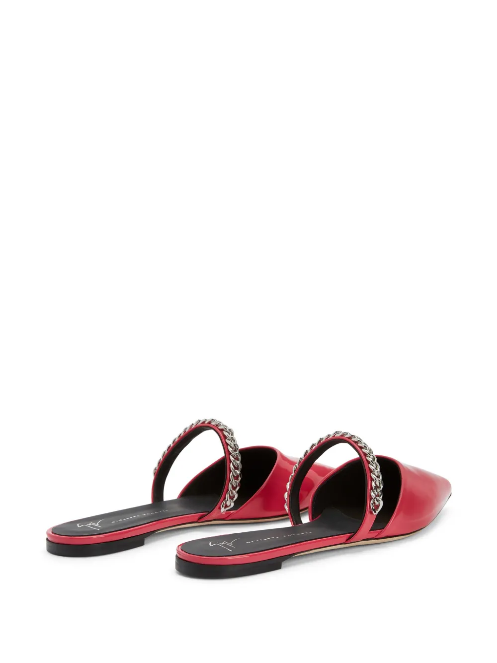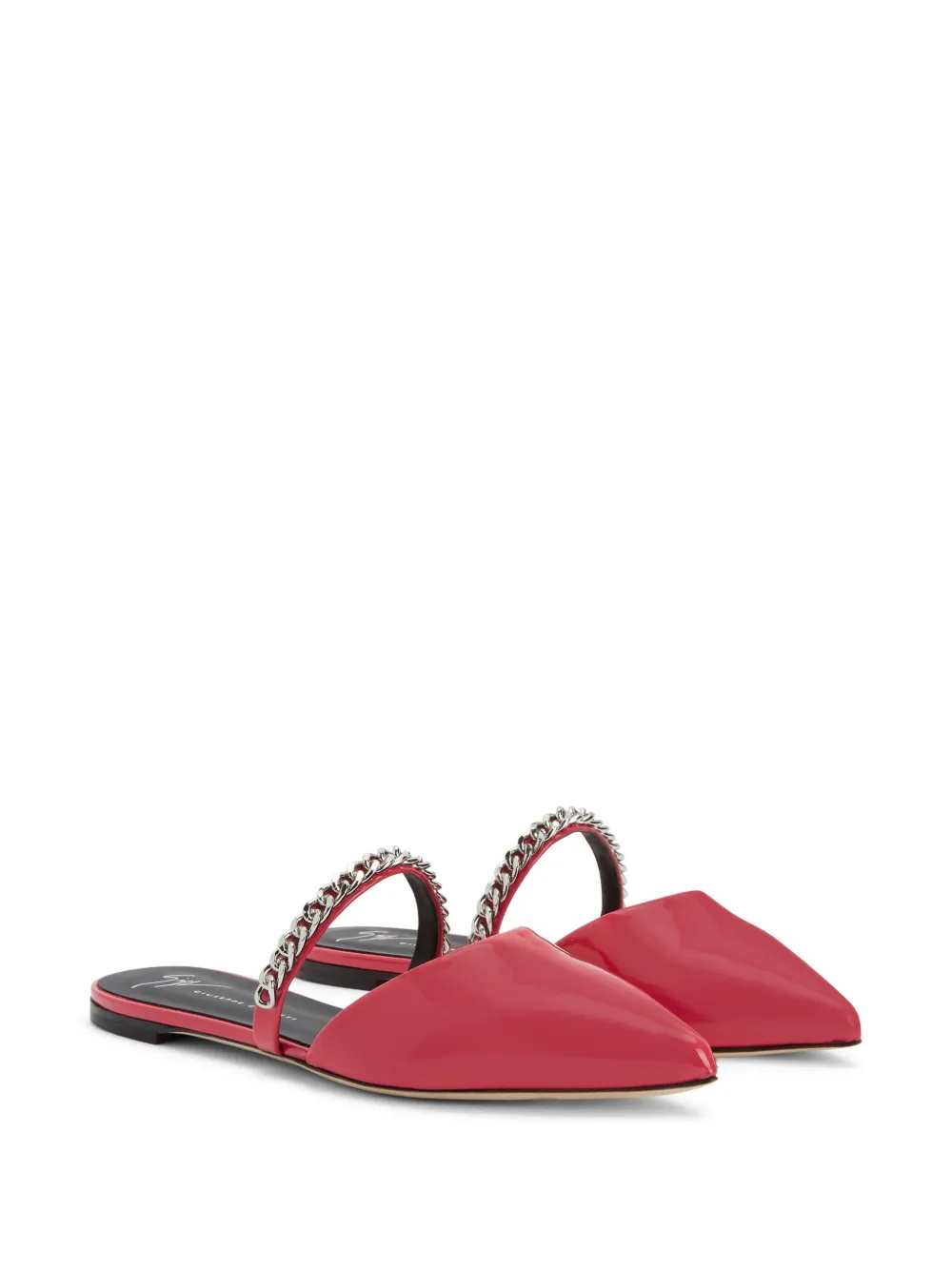 Малиновый, лакированная отделка, серебристая фурнитура, цепочка, заостренный носок, модель без застежки, стелька с логотипом и плоская кожаная подошва.
