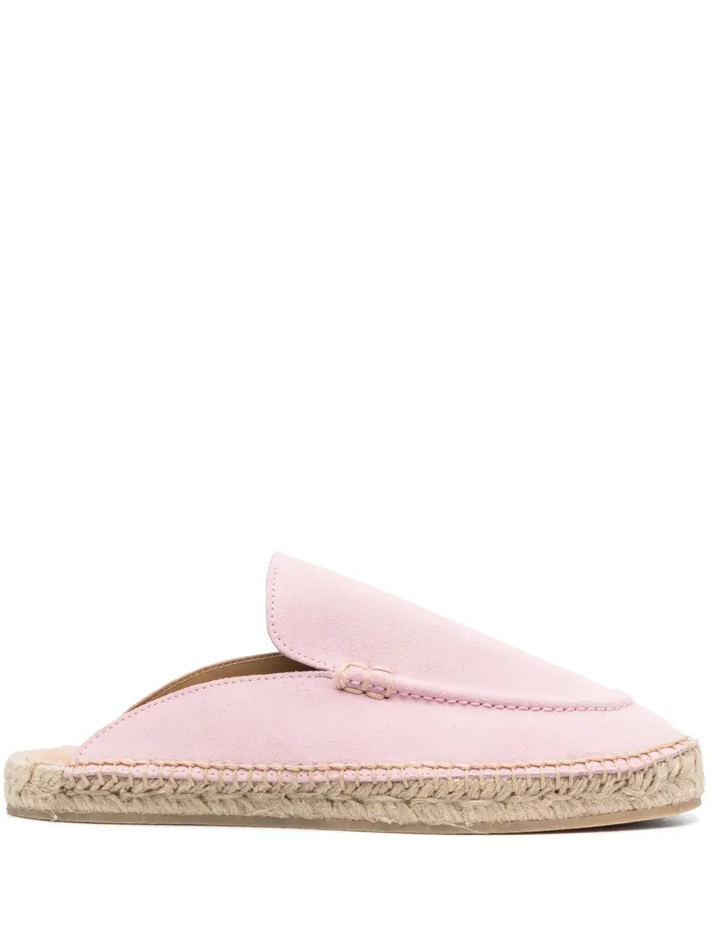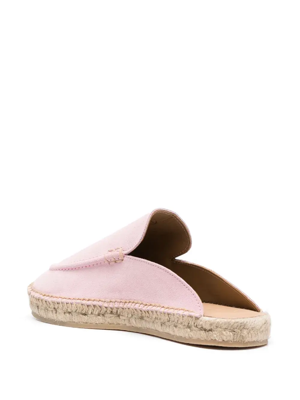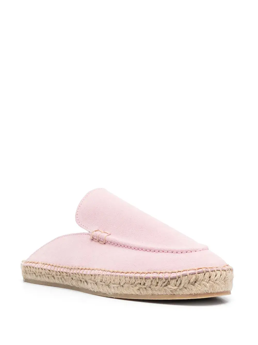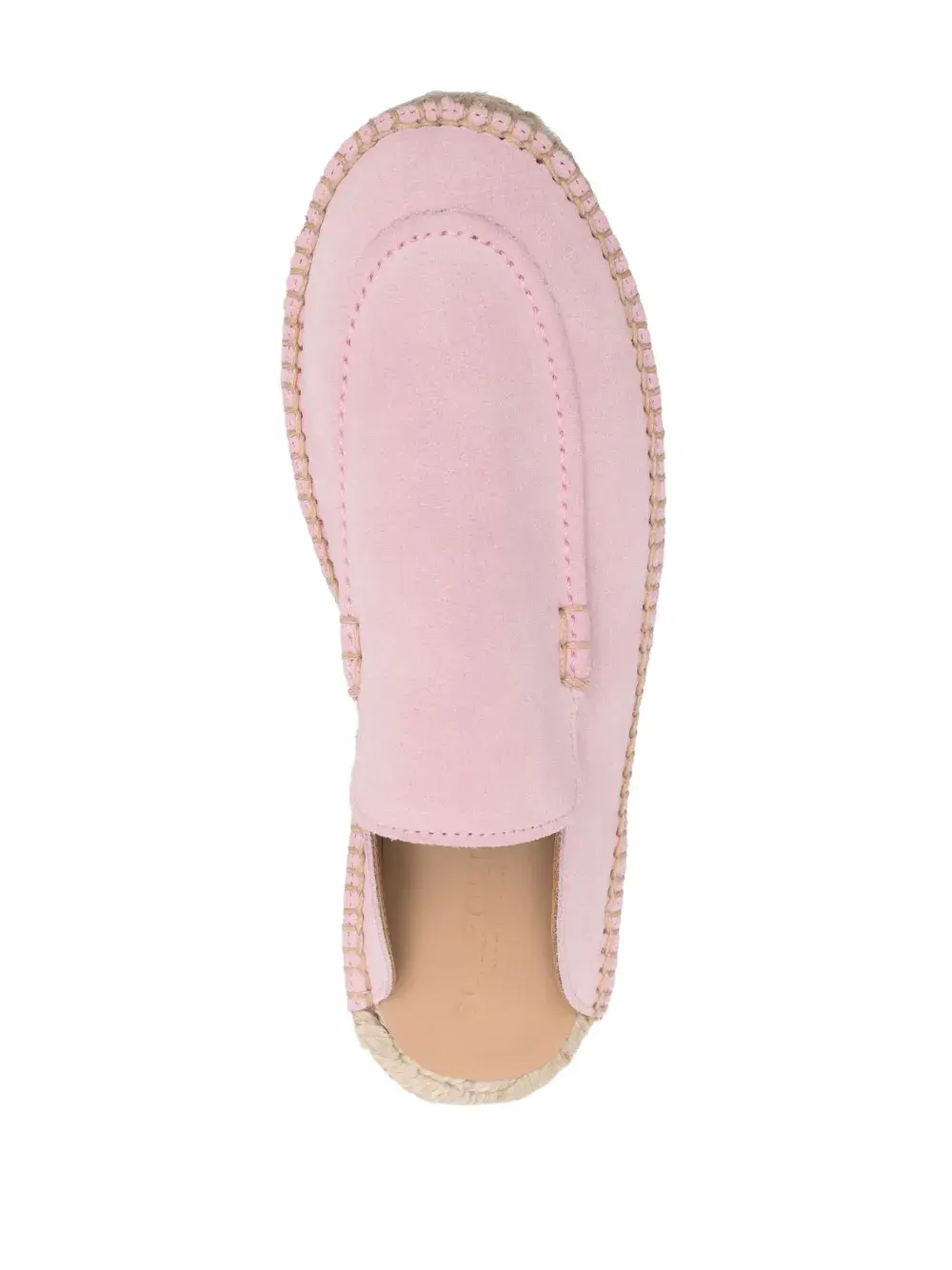 Светло-розовый, замша, модель без застежки, закругленный носок, стелька с логотипом и плетеная подошва из рафии.