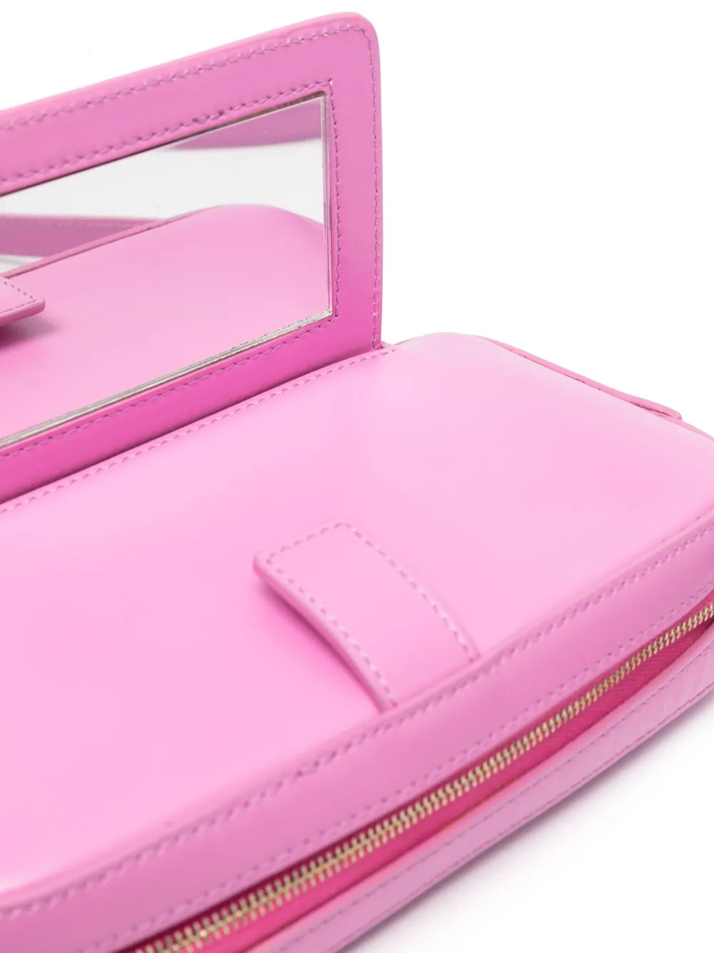 Нежно-розовый, телячья кожа, золотистый металлический логотип, застежка на молнии сверху, регулируемый ремень на плечо, основное отделение, внутреннее зеркало и нашивка с логотипом внутри.