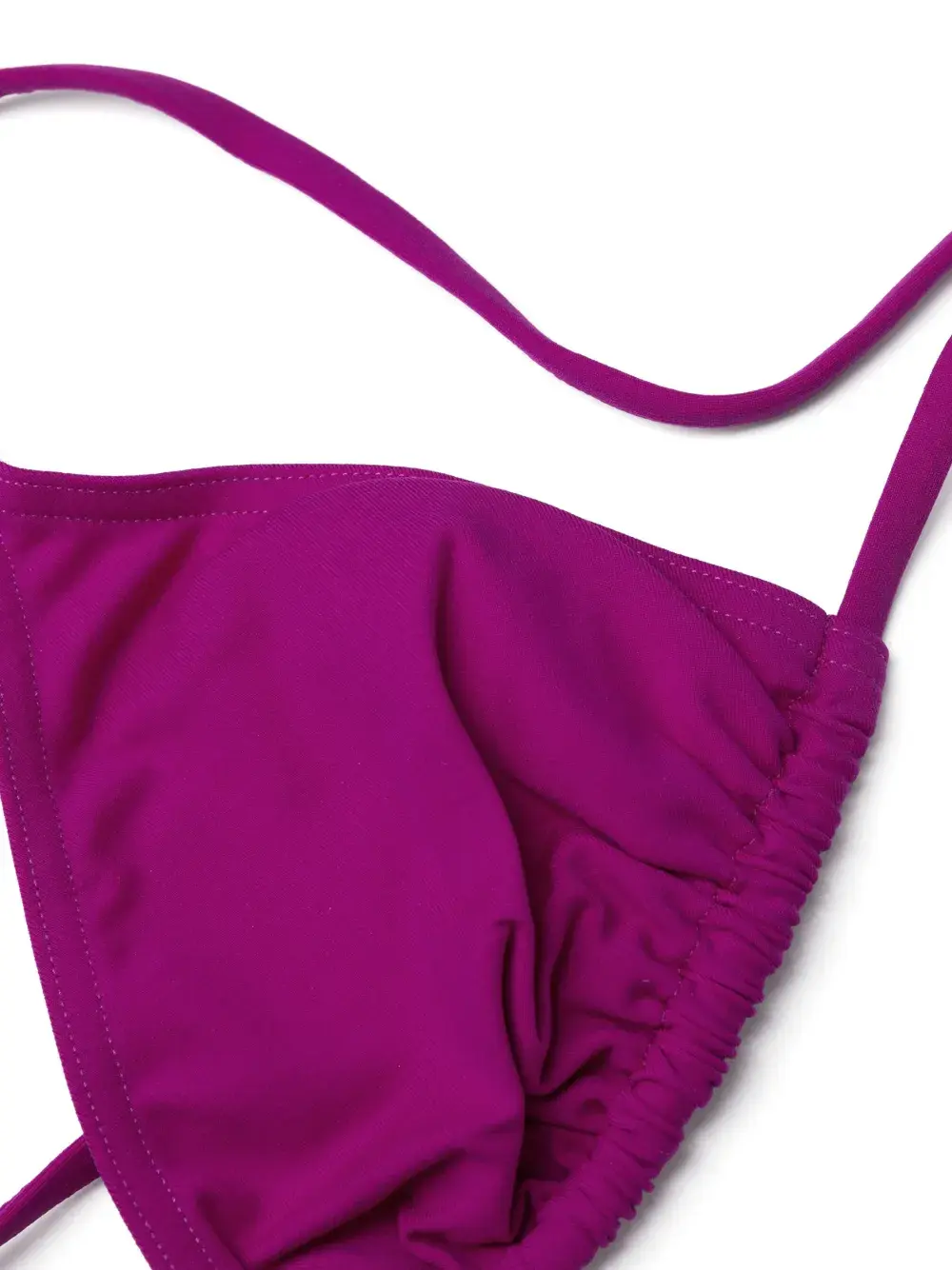 Фиолетовый, эластичный материал, треугольная чашка, застежка на завязке сзади и тонкие бретели. Пожалуйста, примеряйте купальники и пляжные шорты только поверх собственного белья.