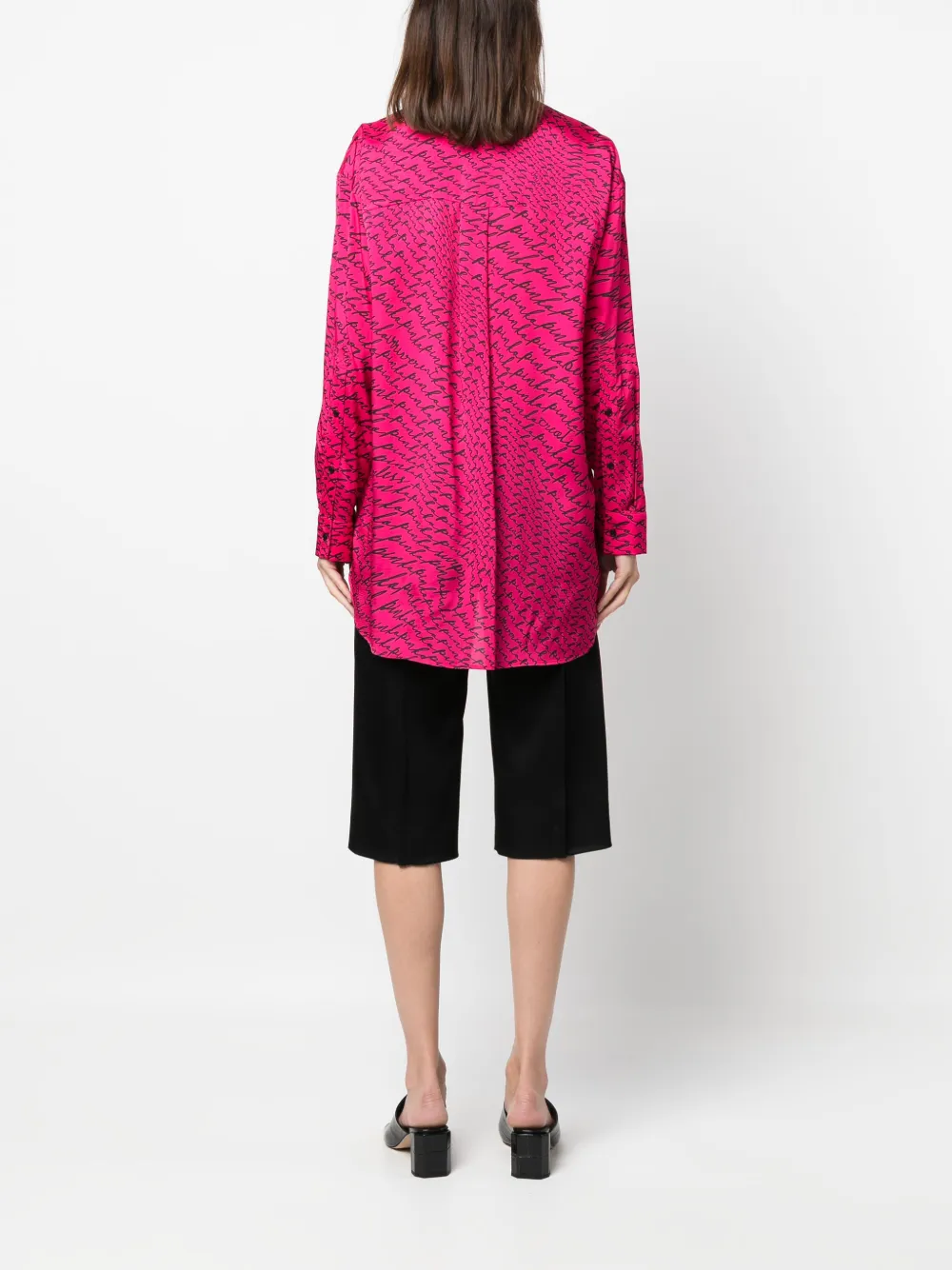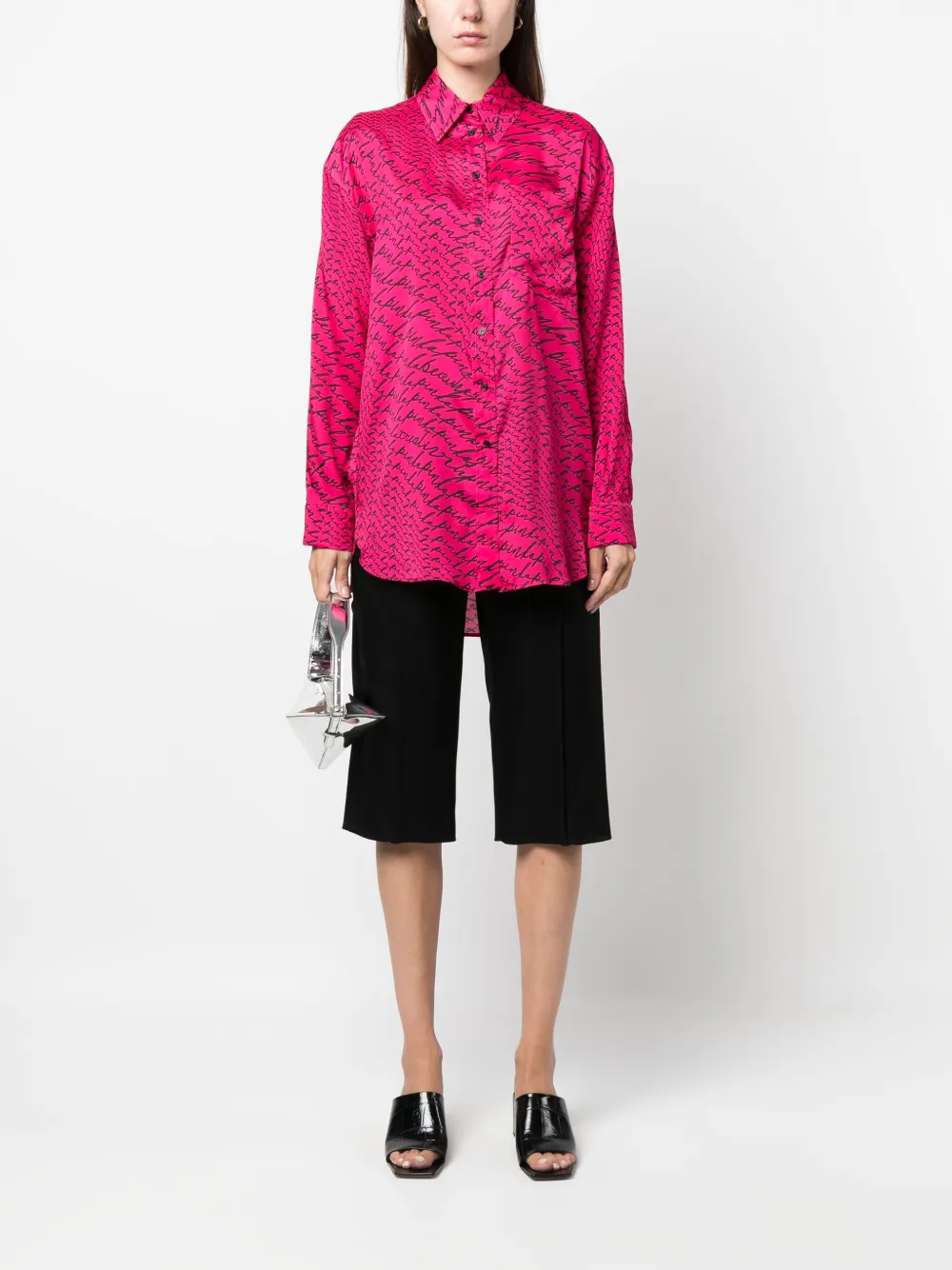 Фуксия, черный, сплошной принт с логотипом, текстовый принт, прямой воротник, застежка на пуговицах спереди, длинные рукава, манжеты на пуговицах и неравномерный подол.
