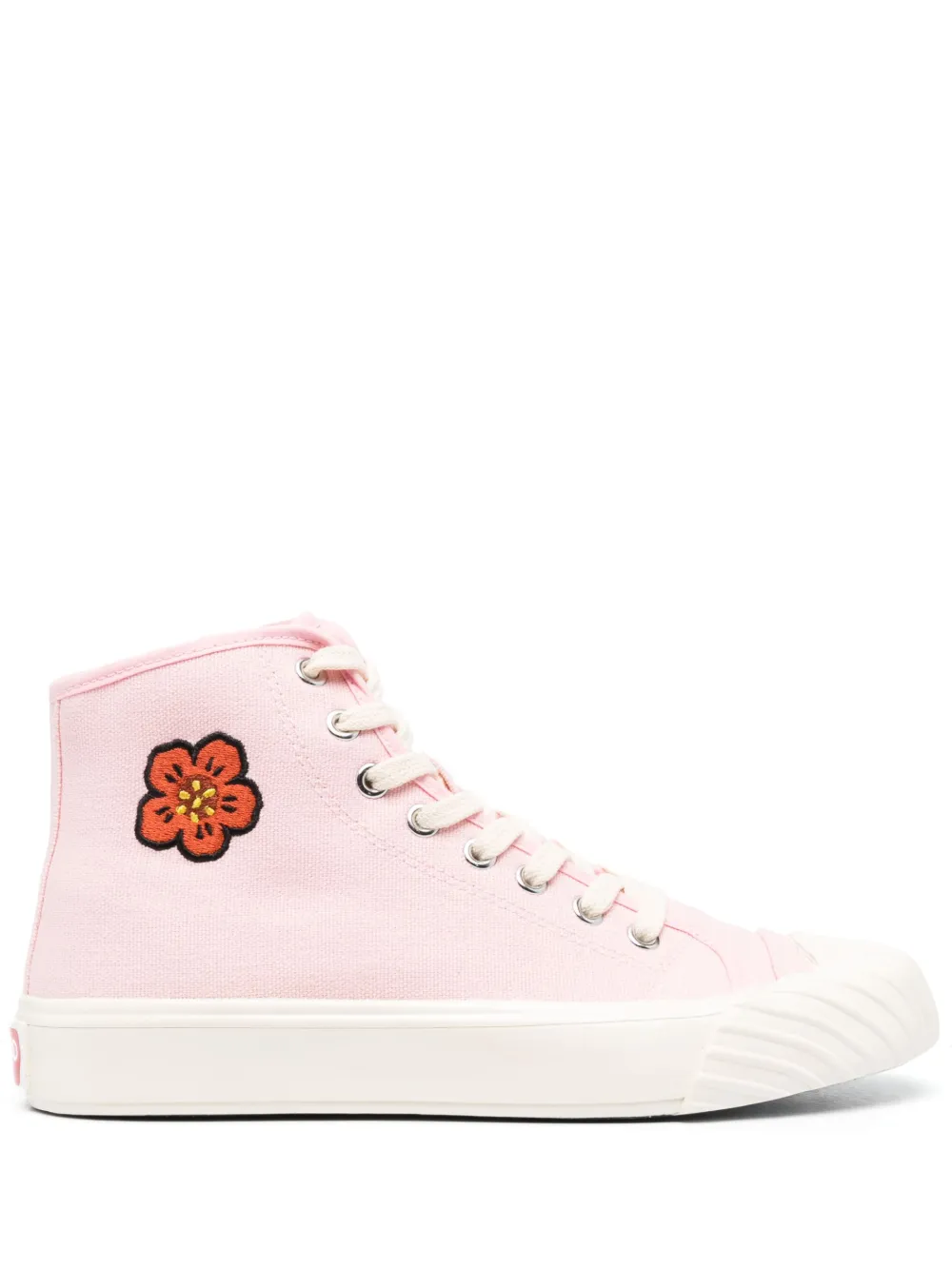 Светло-розовый, красный, парусина, нашивка с логотипом сзади, узор Boke Flower, вентиляционные отверстия, закругленный носок, шнуровка спереди, застежка на молнии сбоку, логотип на стельке и резиновая подошва.