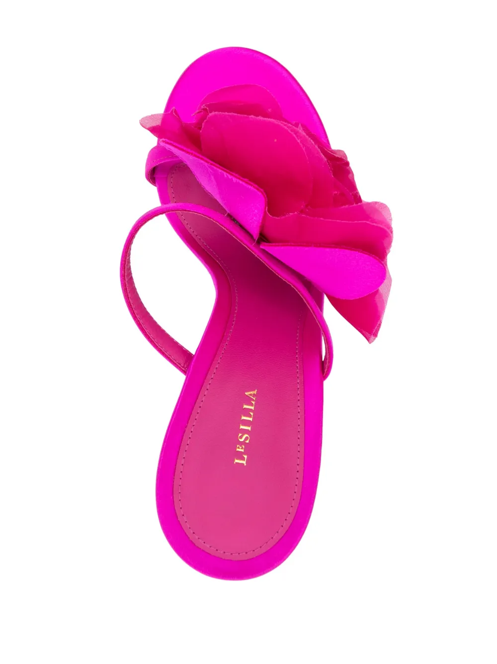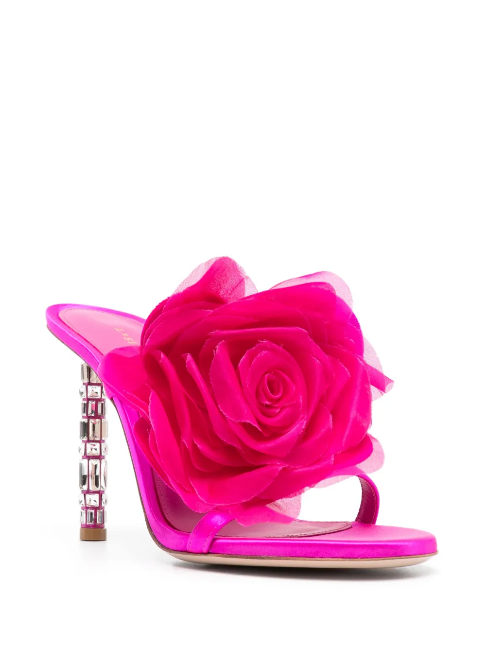 Фуксия, телячья кожа, вышивка с изображением роз, закругленный носок, открытый носок, стелька с логотипом, украшение из поделочных камней, каблук на высокой шпильке и модель без застежки.