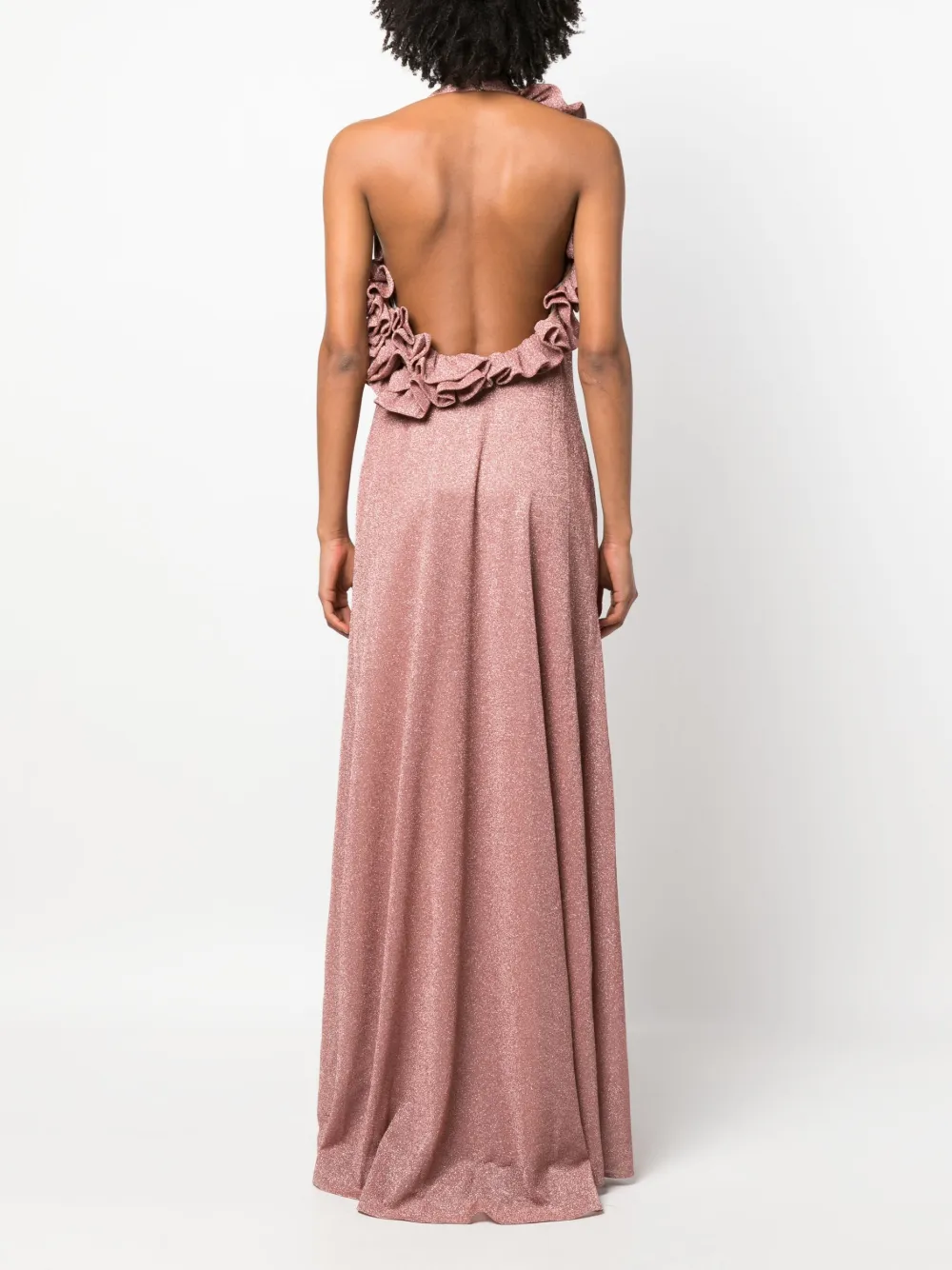 Кораллово-розовый, люрекс, детали с оборками, вырез-петля халтер, круглый вырез, без рукавов, открытая спина и расклешенный крой.