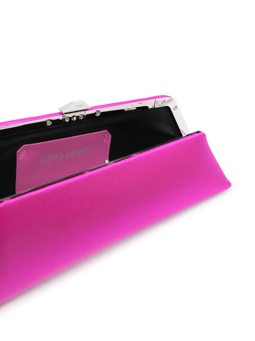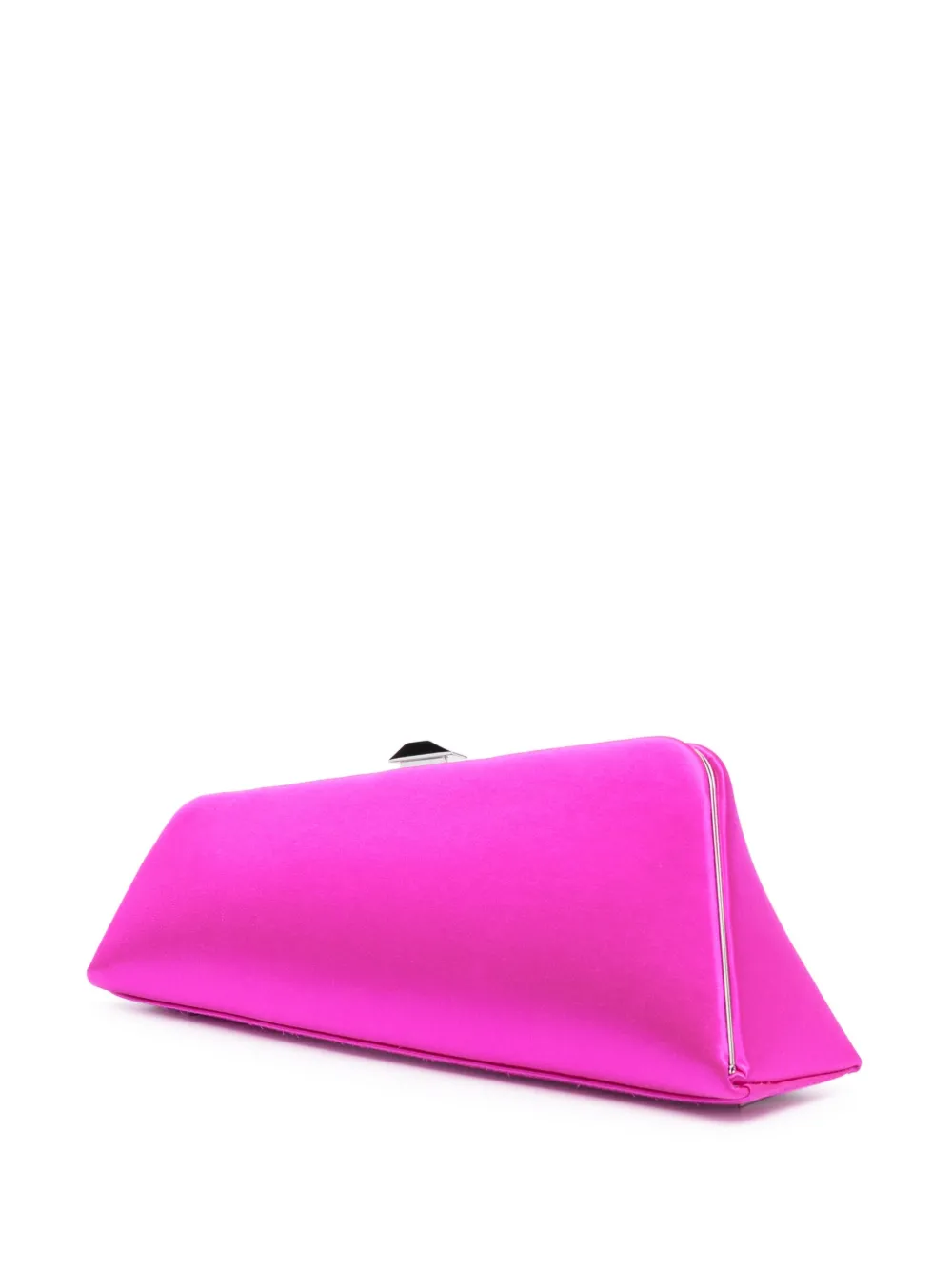 Фуксия, телячья кожа, застежка на зажиме, съемный ремень на плечо и основное отделение.