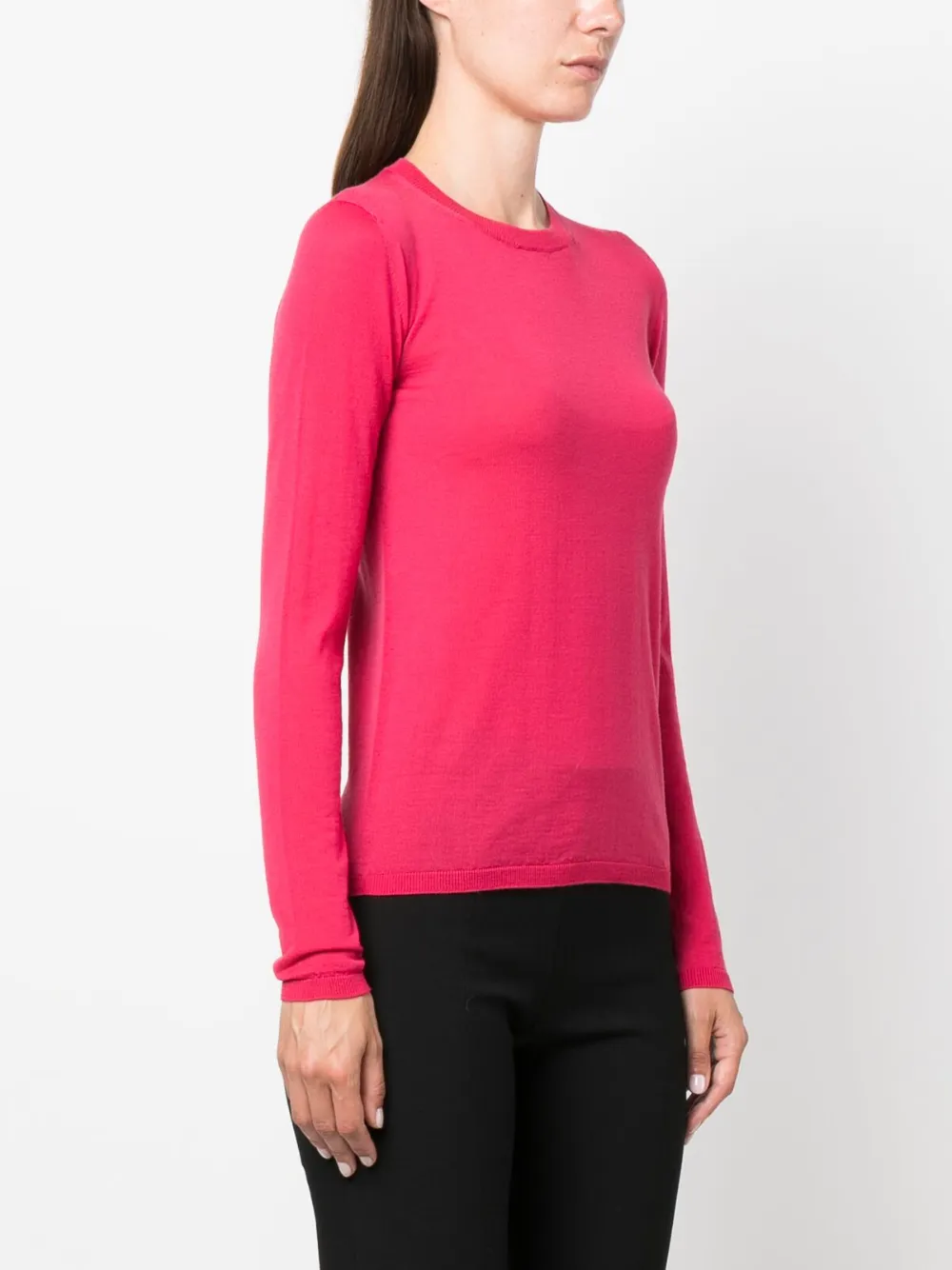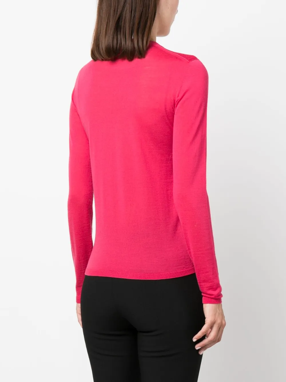 Фуксия, необработанная шерсть, трикотаж в рубчик, воротник-стойка в рубчик и длинные рукава.