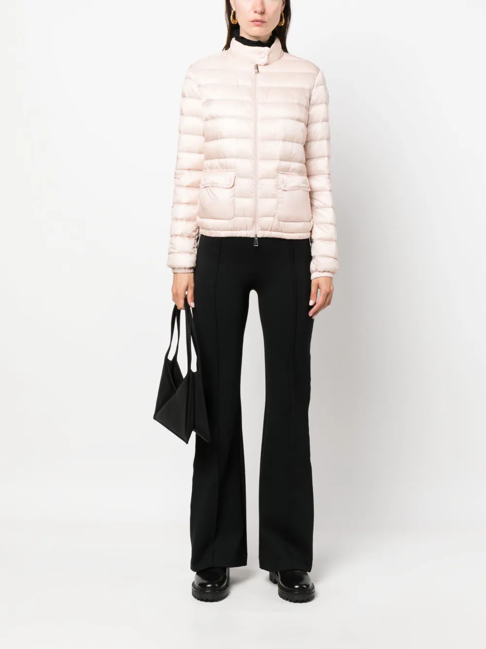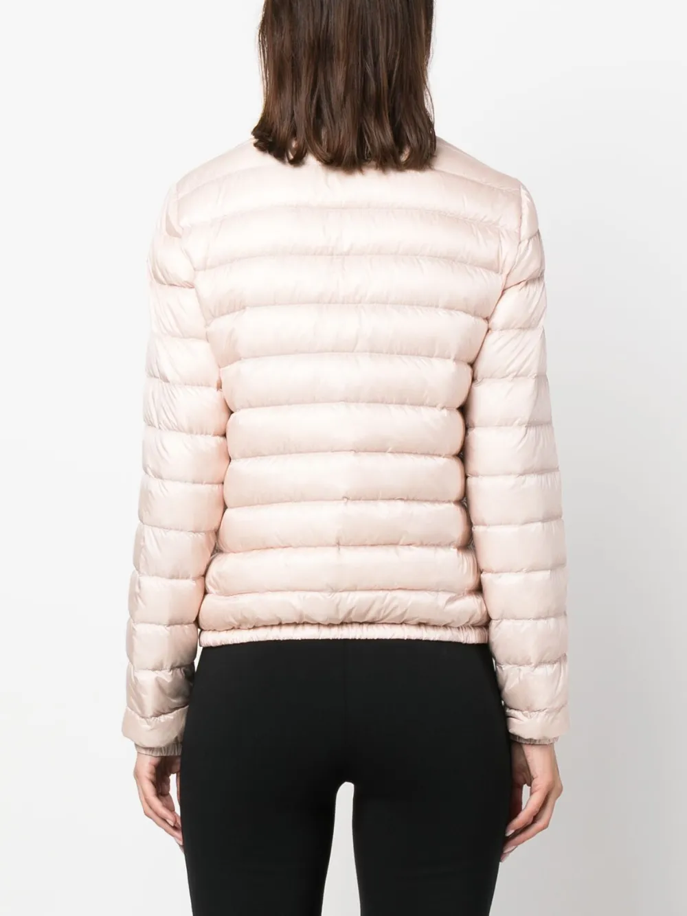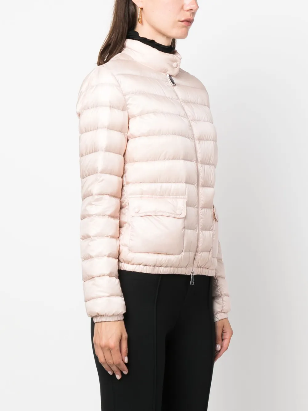 Светло-розовый, наполнитель из пуха и перьев, дутый материал, высокий воротник, застежка на молнии спереди, длинные рукава, два передних кармана с клапанами и прямой подол.