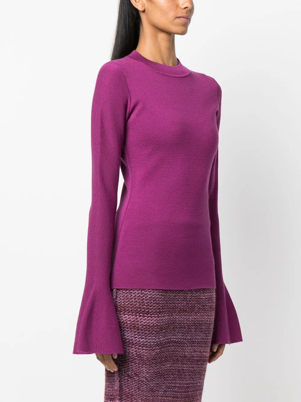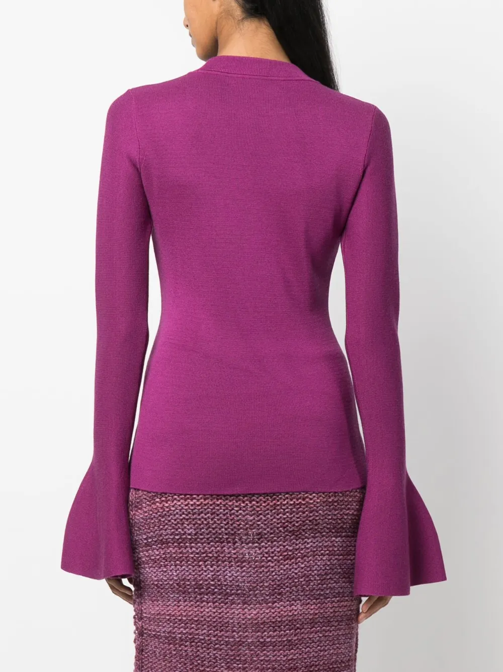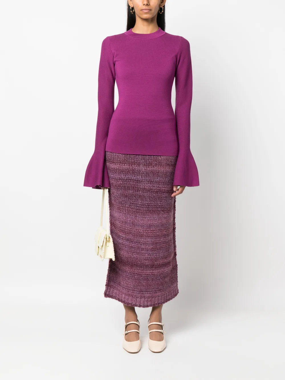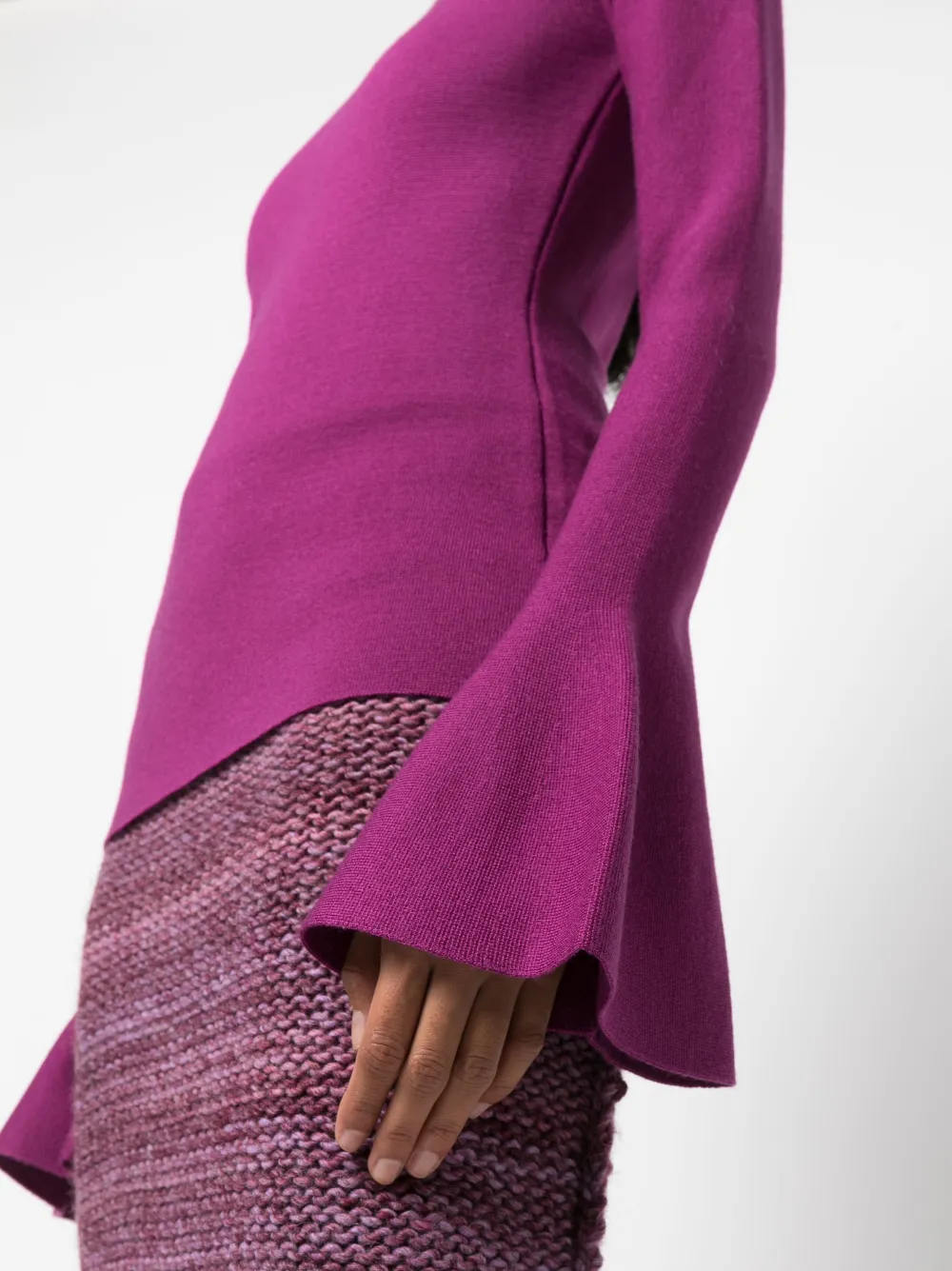 Фуксия, тонкая вязка и расклешенные манжеты.