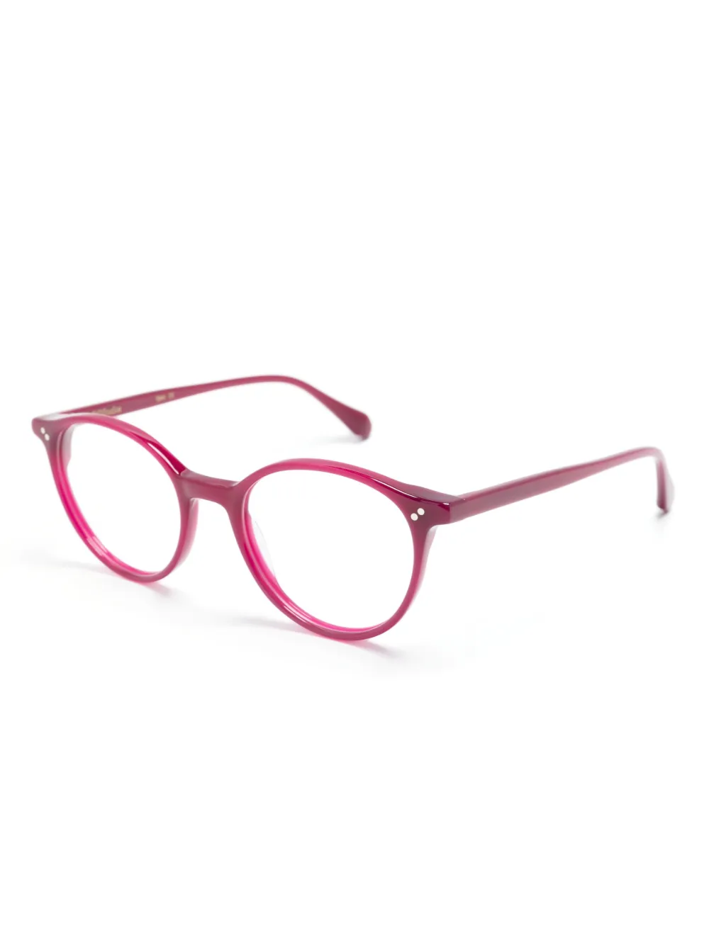 Фуксия, ацетат, золотистая фурнитура, круглая оправа, прямые дужки и дужки с закругленными концами. В комплект входит защитный чехол для очков. Обратите внимание, что на FARFETCH продаются оправы с линзами без диоптрий.