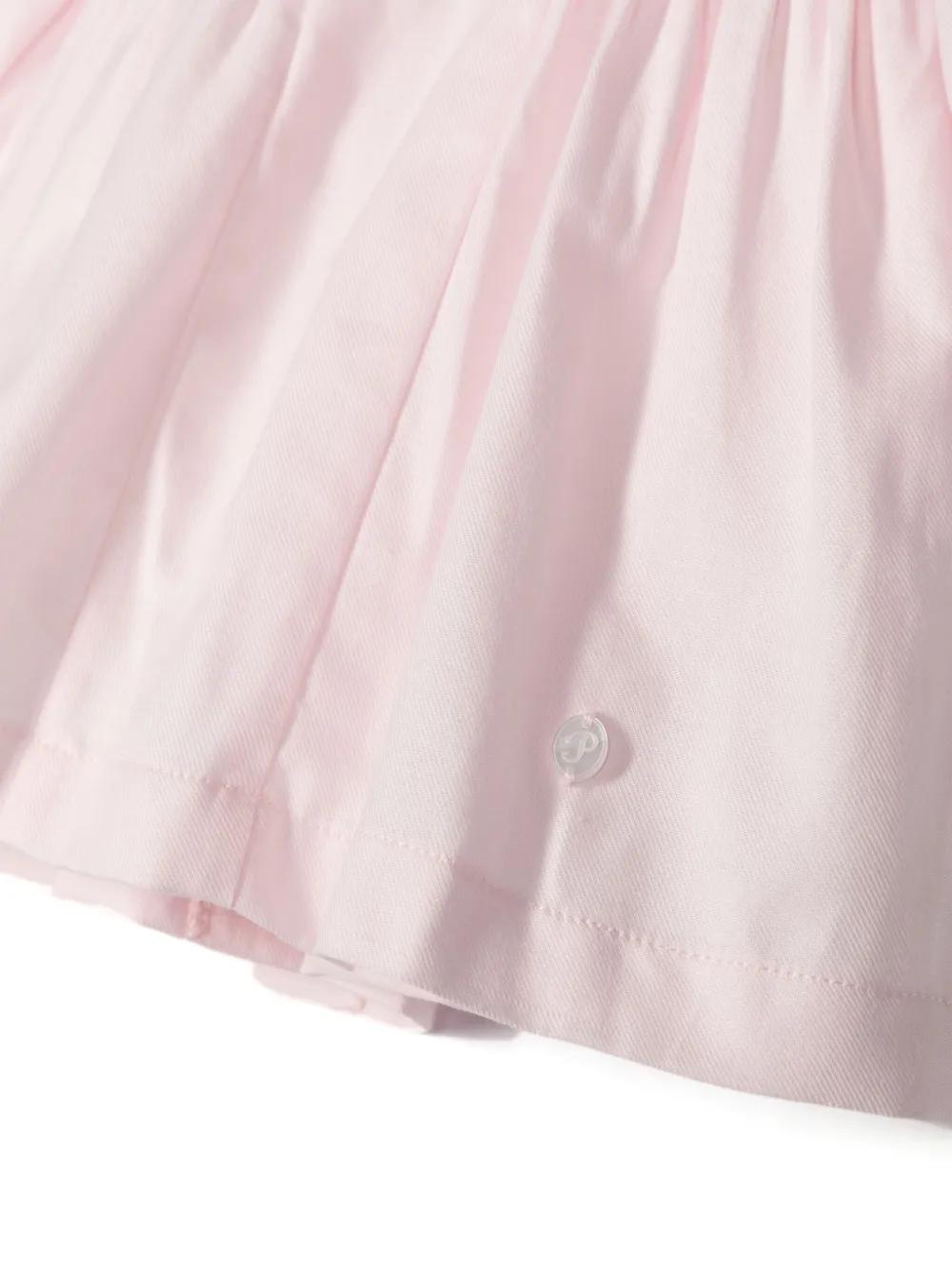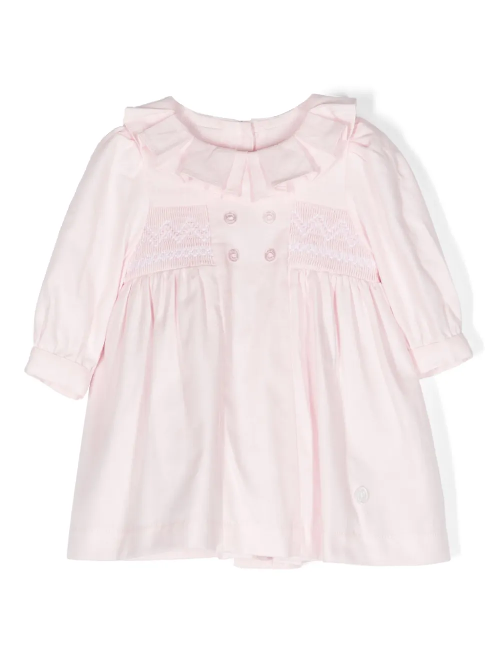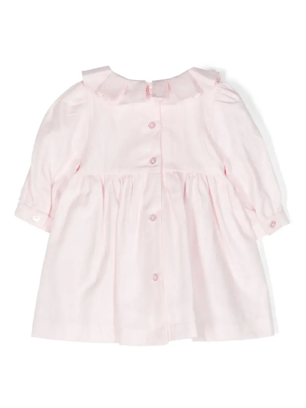 Пудрово-розовый, хлопок, металлический логотип, вышитый узор, декоративные пуговицы, отделка со сборками, воротник с оборками, застежка на пуговицы сзади, длинные рукава, манжеты на пуговицах и расклешенный подол.