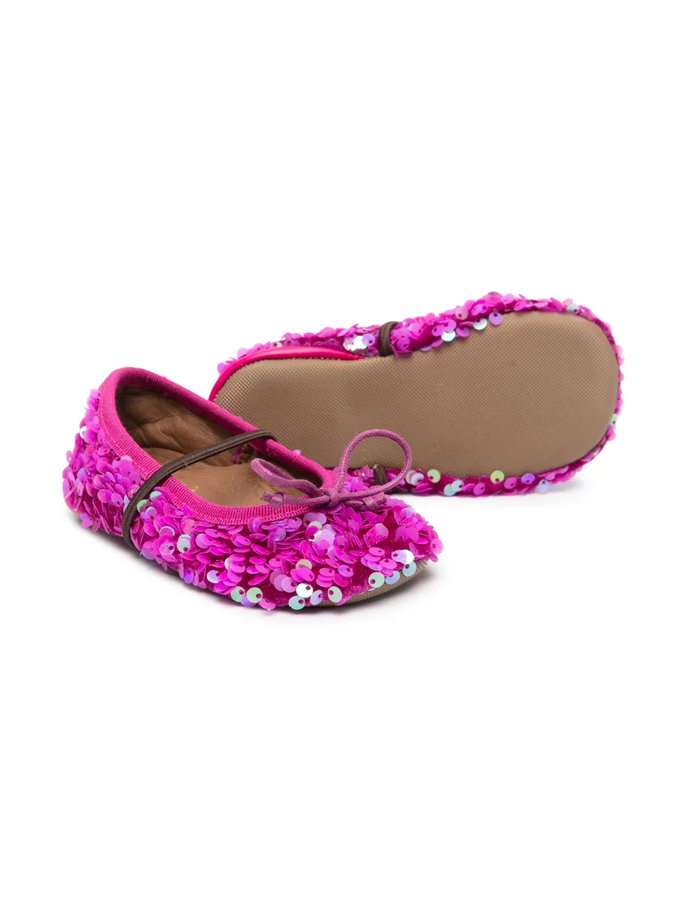 Фуксия, телячья кожа, украшение из пайеток, бант, вставка из эластичной ленты, модель без застежки, закругленный носок и плоская резиновая подошва.