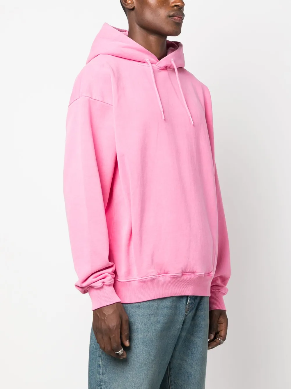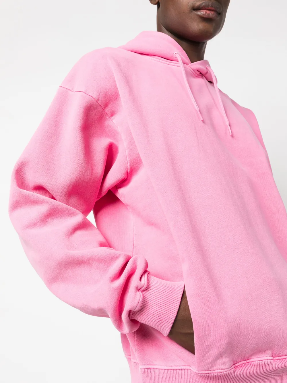 Бледно-розовый, хлопок, принт с логотипом сзади, затягивающийся на шнурок капюшон, приспущенные плечи, длинные рукава и прямой подол.