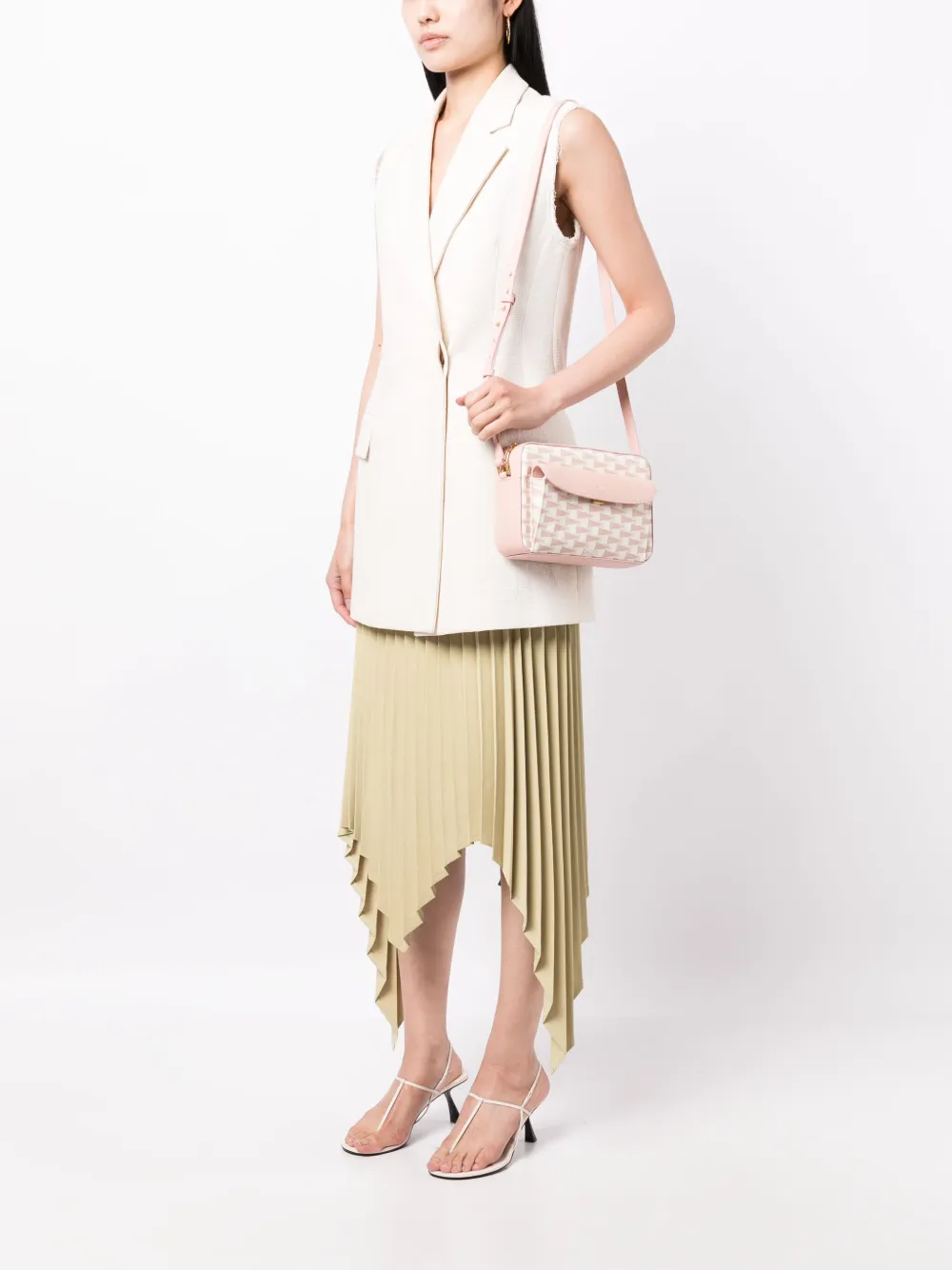 Светло-розовый, белый, кожа, зернистая текстура, узор с изображением монограммы, золотистый логотип, застежка на молнии сверху, золотистая фурнитура, регулируемый ремень на плечо, основное отделение, внутренний карман на молнии и карман-муфта.