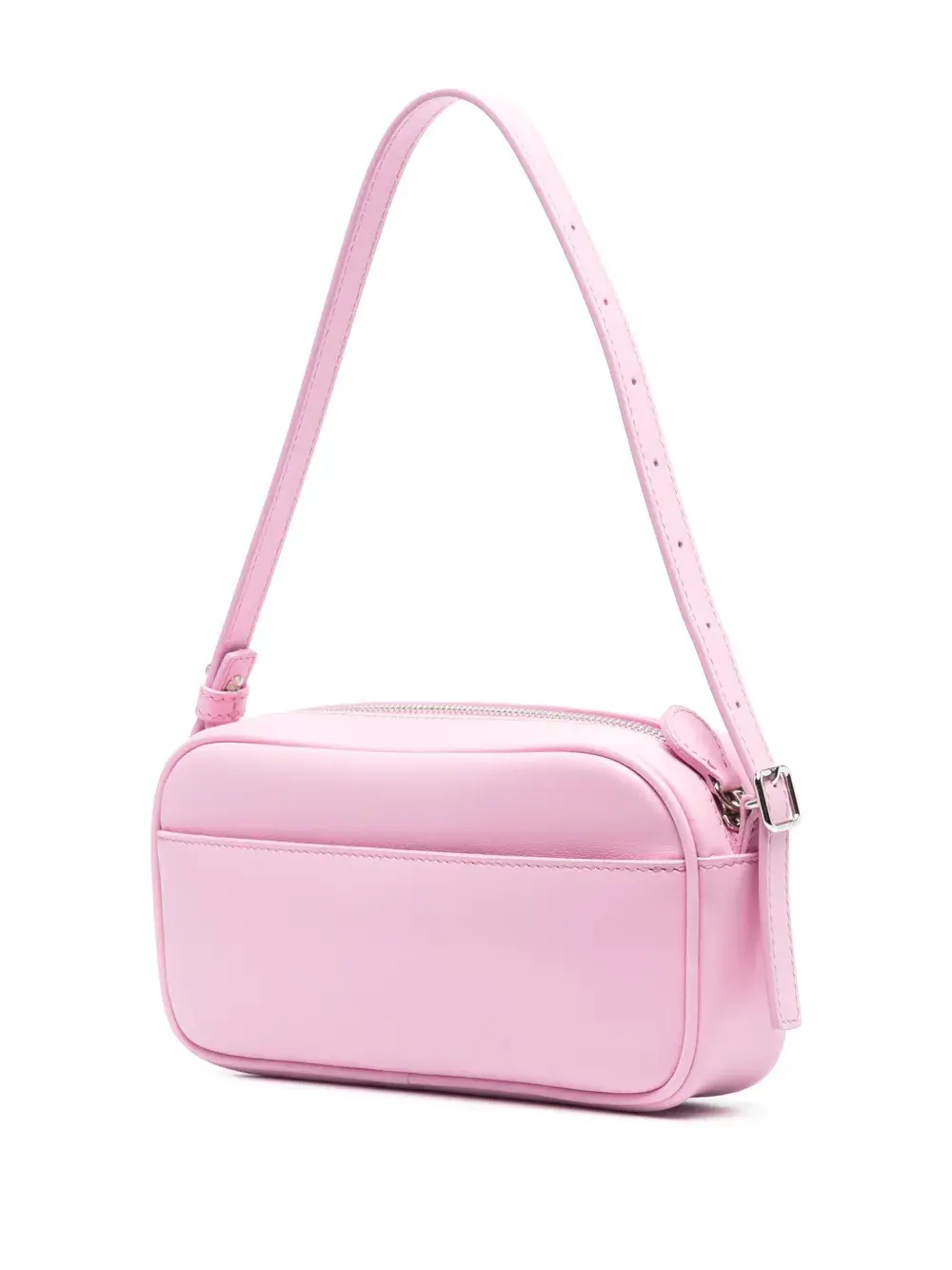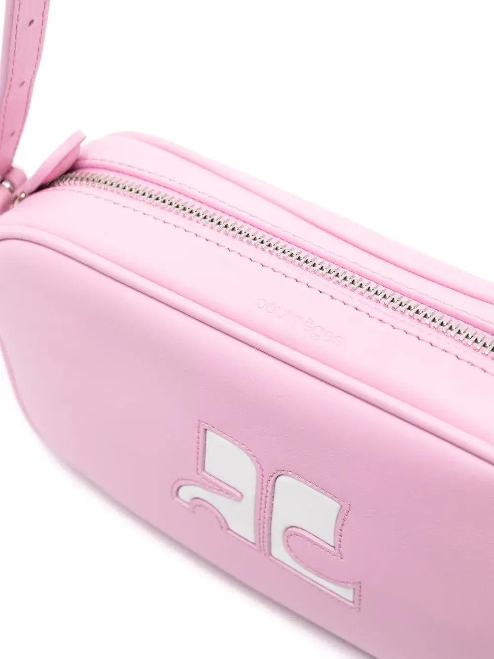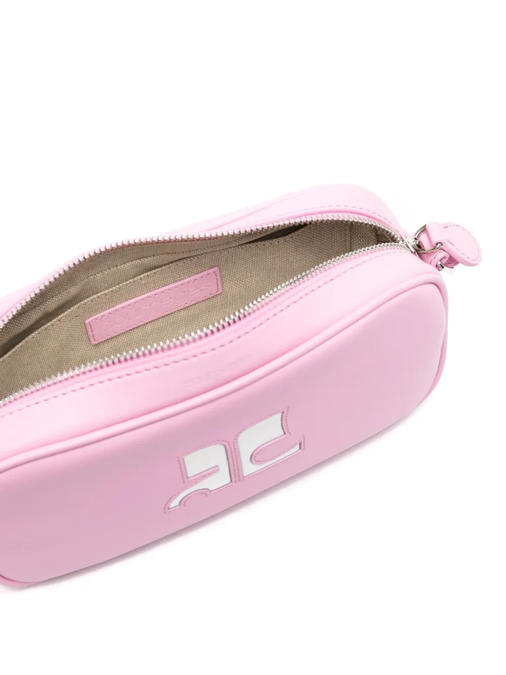 Расцветка Blush Pink, серовато-белый, телячья кожа, гладкая текстура кожи, тисненый логотип спереди, нашивка с логотипом внутри, строчка в тон, застежка на молнии сверху, регулируемый ремень на плечо, прорезной карман сзади, внутренний прорезной карман и парусиновая подкладка.