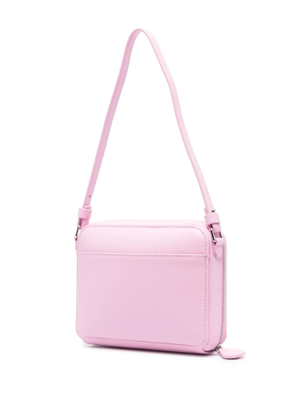 Нежно-розовый, телячья кожа, гладкая текстура кожи, строчка в тон, серебристый металлический логотип, серебристая фурнитура, съемный регулируемый ремень на плечо, застежка на молнии сверху, основное отделение, тисненый логотип внутри, внутреннее отделение для карт и подкладка из хлопка.