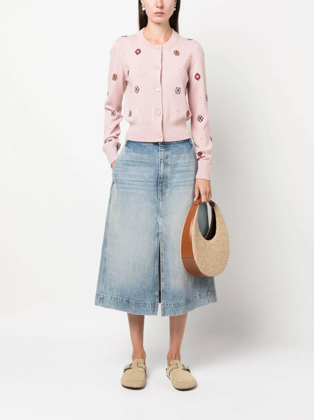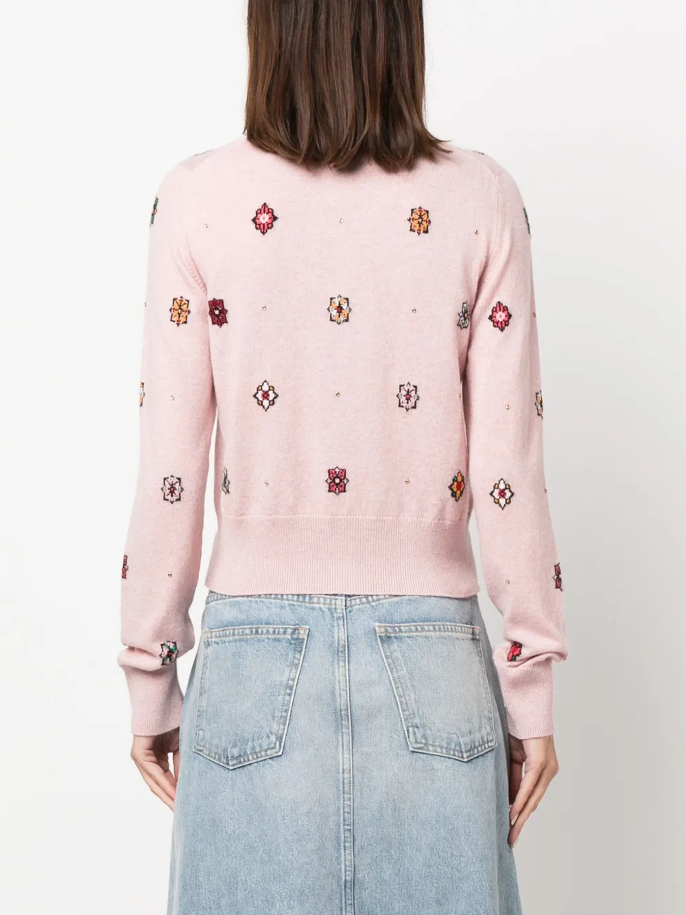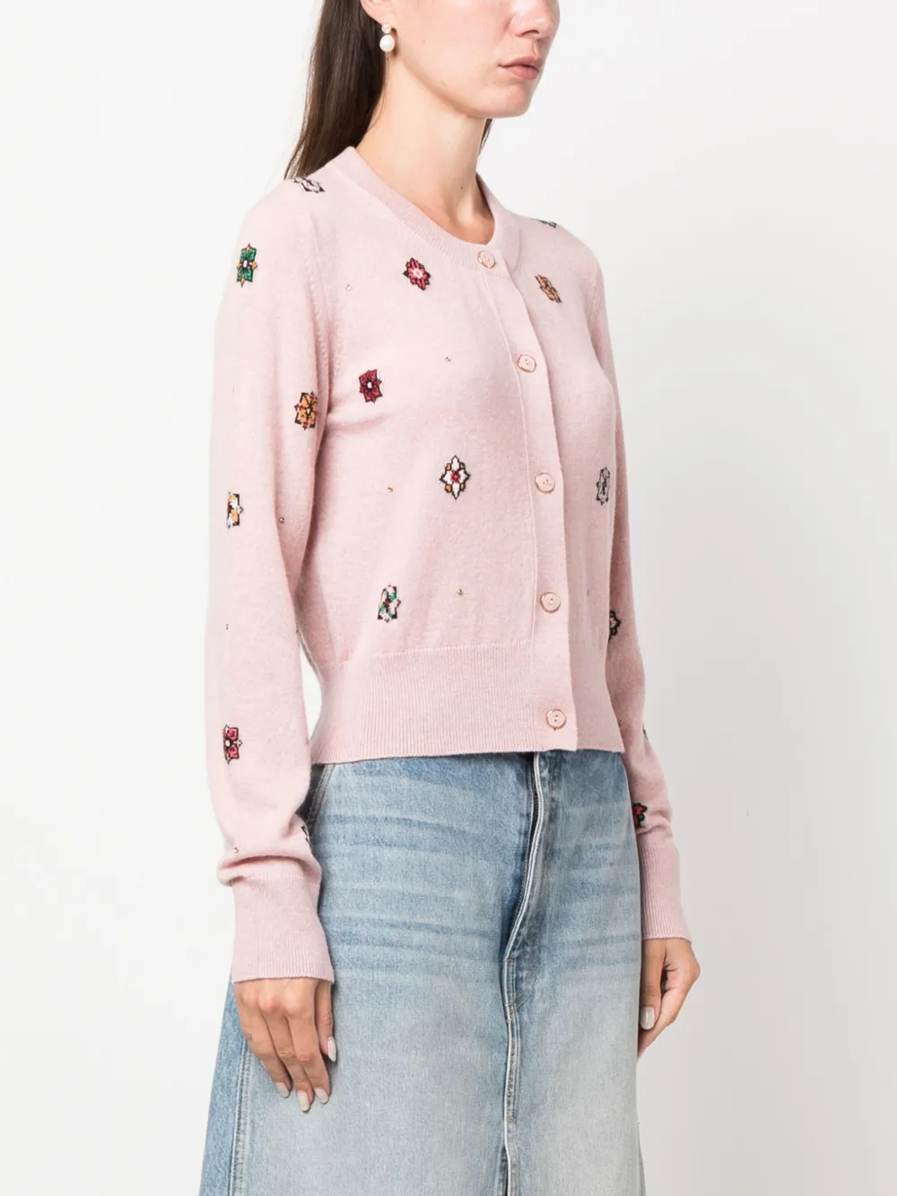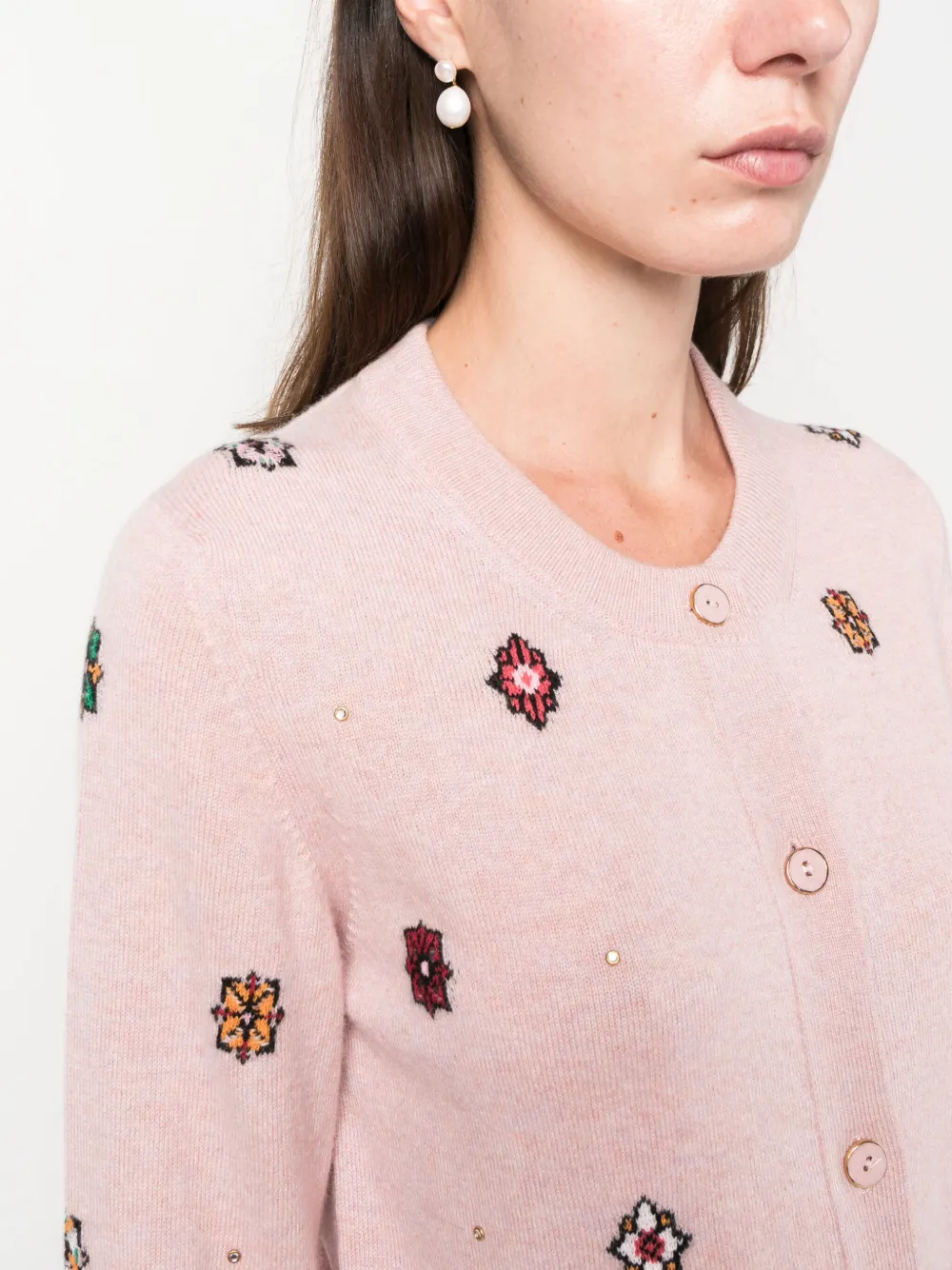 Пудрово-розовый, разноцветный, смесь хлопка и кашемира, трикотаж в рубчик, вязка в технике интарсия, цветочный узор, круглый вырез, застежка на пуговицах спереди и длинные рукава.