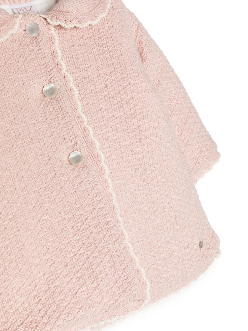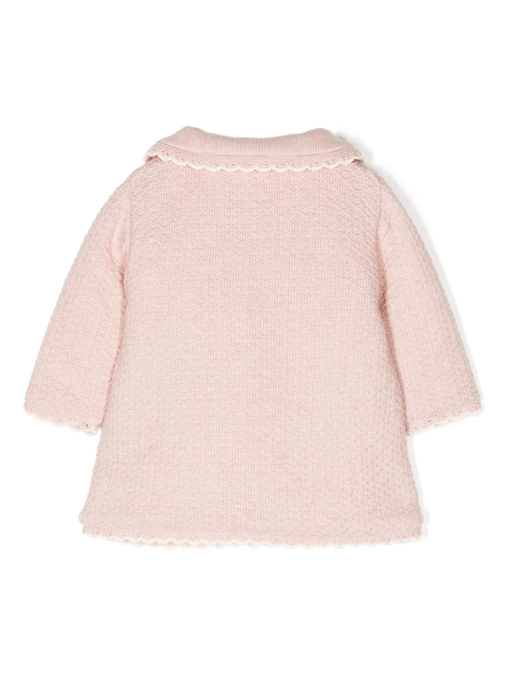Светло-розовый, смесь хлопка и кашемира, трикотажный материал, воротник Питер Пэн, застежка на пуговицах спереди, длинные рукава и подол с фестонами.