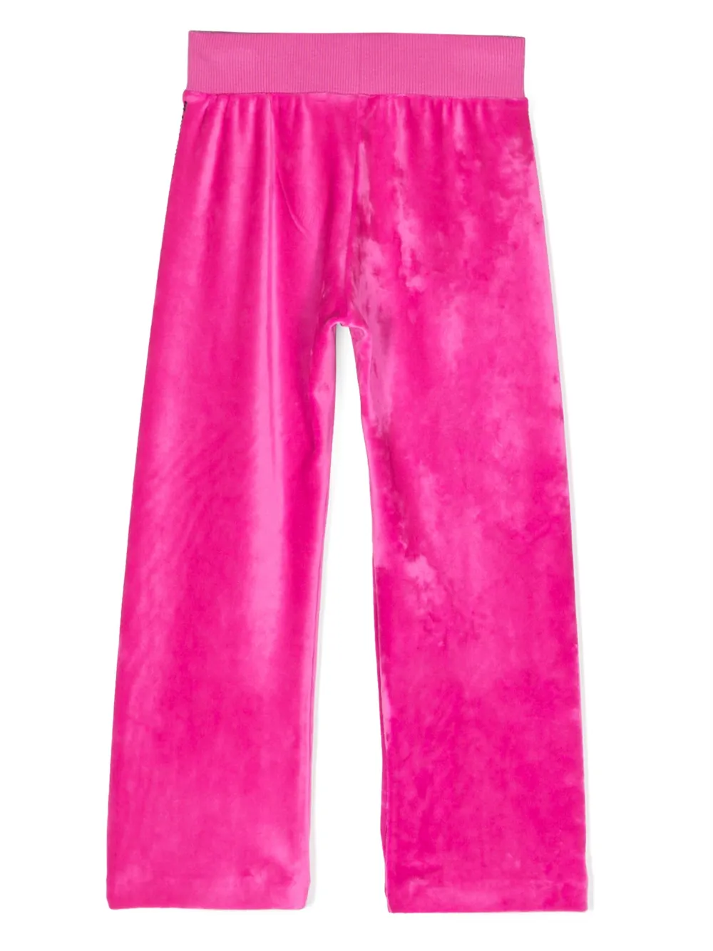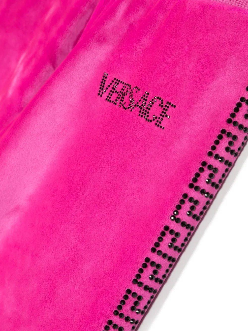 Фуксия, бархатный эффект, знаковый орнамент Greca, логотип сбоку, декор из кристаллов, эластичный пояс и прямой крой.