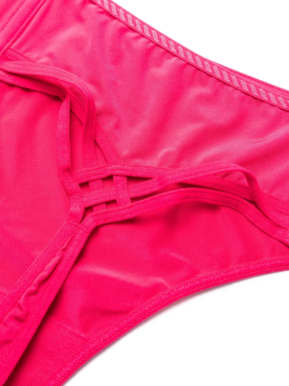 Малиновый, эластичный материал, перекрестные ремешки, эластичный пояс и стринги. Эту вещь можно примерить, но только поверх собственного белья. Узнать больше о том, какие товары получают отметку «Ответственный выбор», можно из материала «Как мы оцениваем экологичность и этичность».