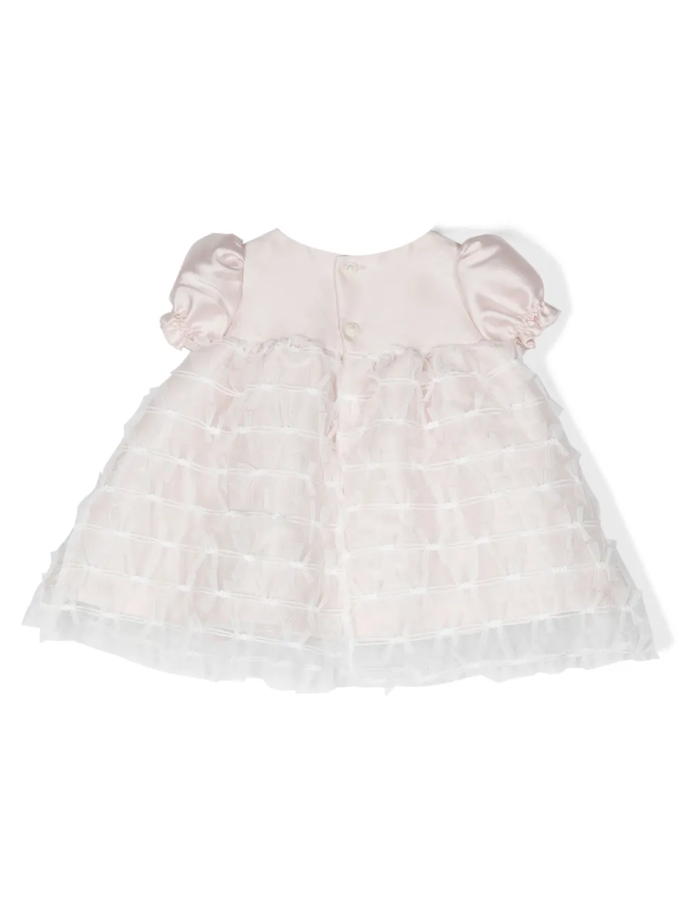 Светло-розовый, хлопок, бант, вставка из тюля, без воротника, застежка на пуговицы сзади, короткие объемные рукава и прямой подол.