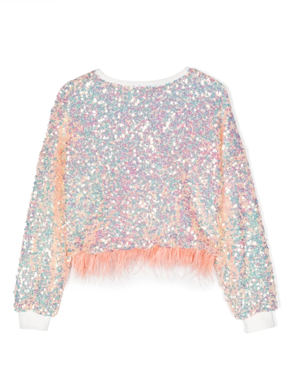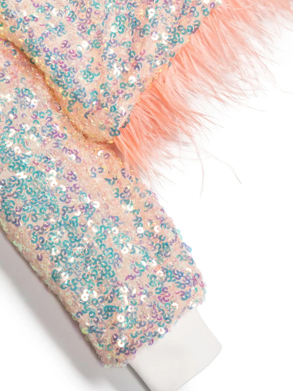 Персиково-розовый, переливающийся, украшение из пайеток, перья, круглый вырез, длинные рукава и прямой подол. Узнать больше о том, какие товары получают отметку «Ответственный выбор», можно из материала «Как мы оцениваем экологичность и этичность».