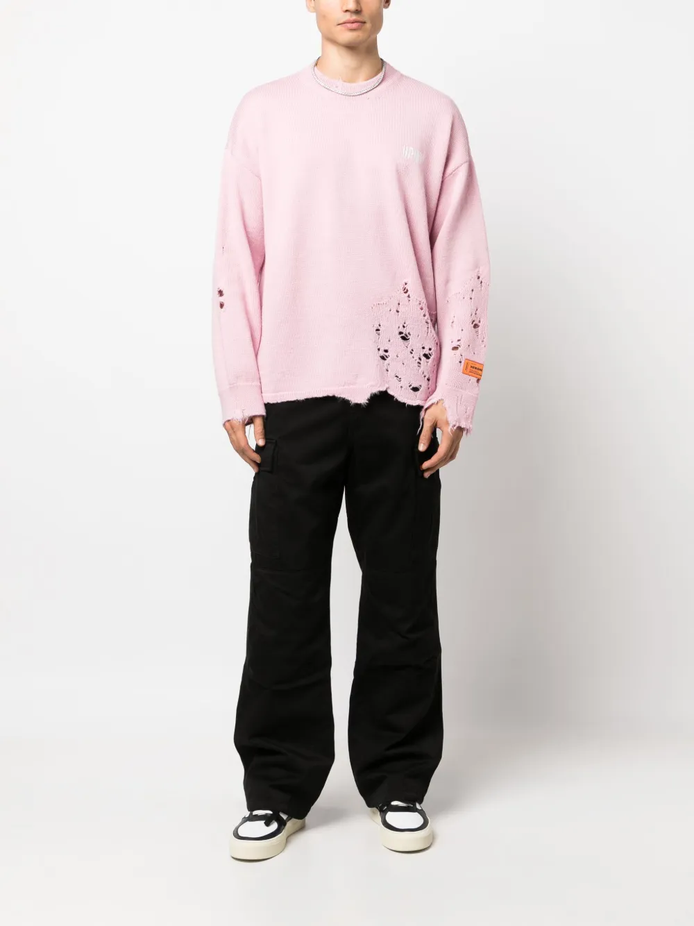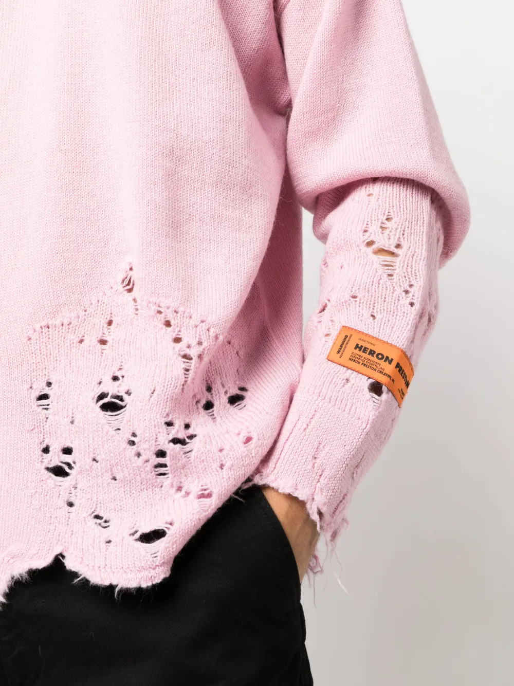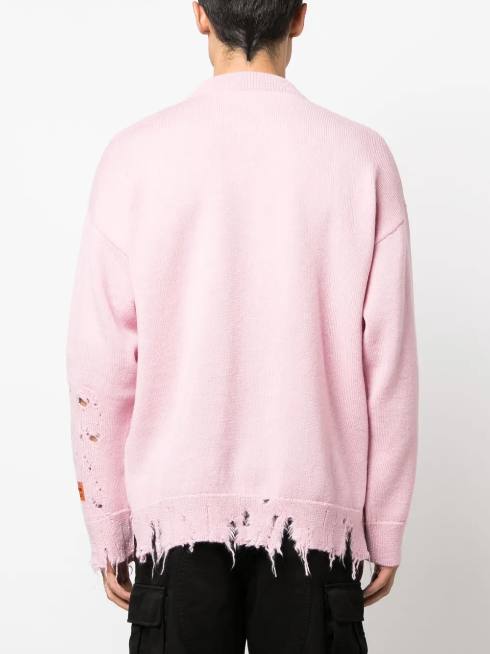 Светло-розовый, необработанная шерсть, трикотажный материал, модель с прорезями, вышитый логотип на груди, нашивка с логотипом на рукаве, отделка в рубчик, круглый вырез, приспущенные плечи, длинные рукава и необработанные края.