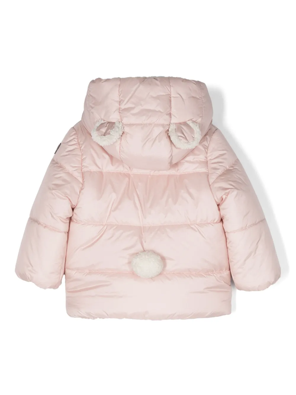Пудрово-розовый, дутый материал, подкладка из шерпы, нашивка с логотипом сбоку, декоративные ушки на капюшоне, помпоны, классический капюшон, застежка на молнии спереди, длинные рукава, два накладных кармана по бокам и прямой подол.