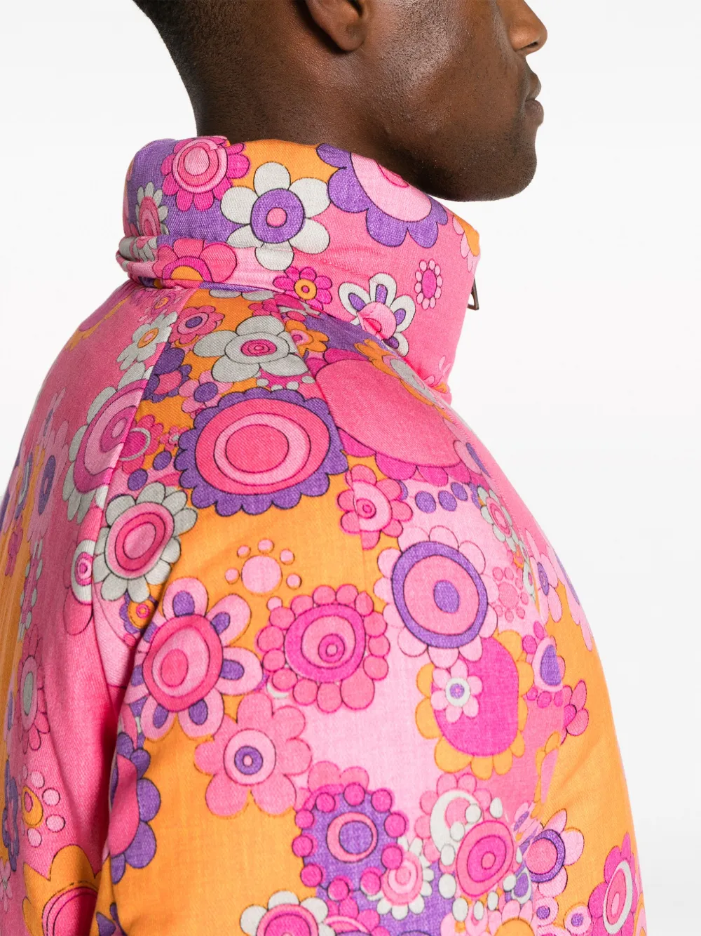 Нежно-розовый, разноцветный, дутый материал, сплошной цветочный принт, воротник-труба, затягивающийся на шнурок капюшон, застежка на молнии спереди, длинные рукава, два кармана на молнии по бокам, эластичная отделка, стеганая подкладка и прямой подол.