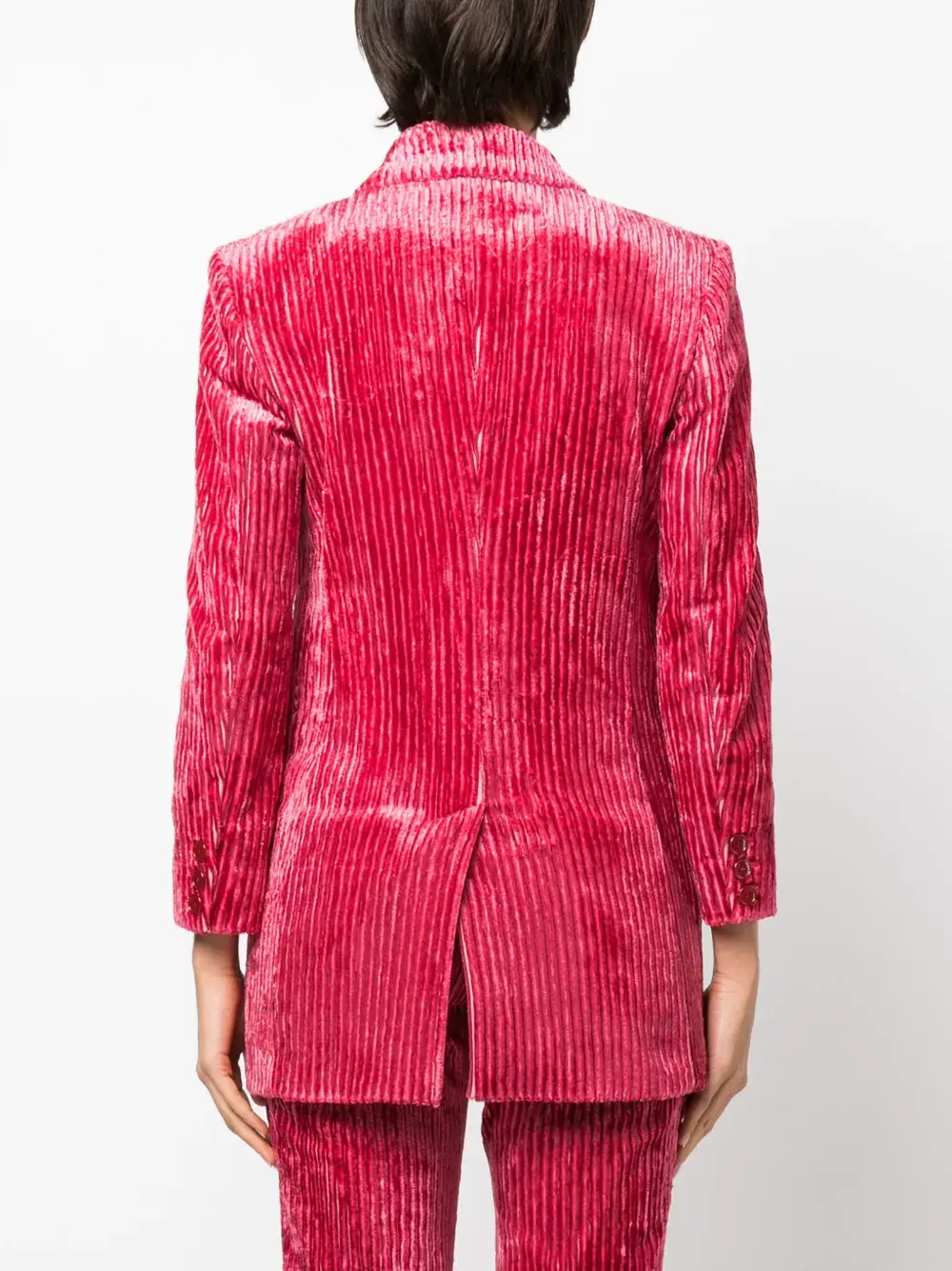 Малиновый, хлопок, вельветовый материал, бархатный эффект, заостренные лацканы, двубортная застежка на кнопки, нагрудный прорезной карман, два кармана с клапанами по бокам, длинные рукава, прямой подол, шлица по центру сзади и цельная подкладка.