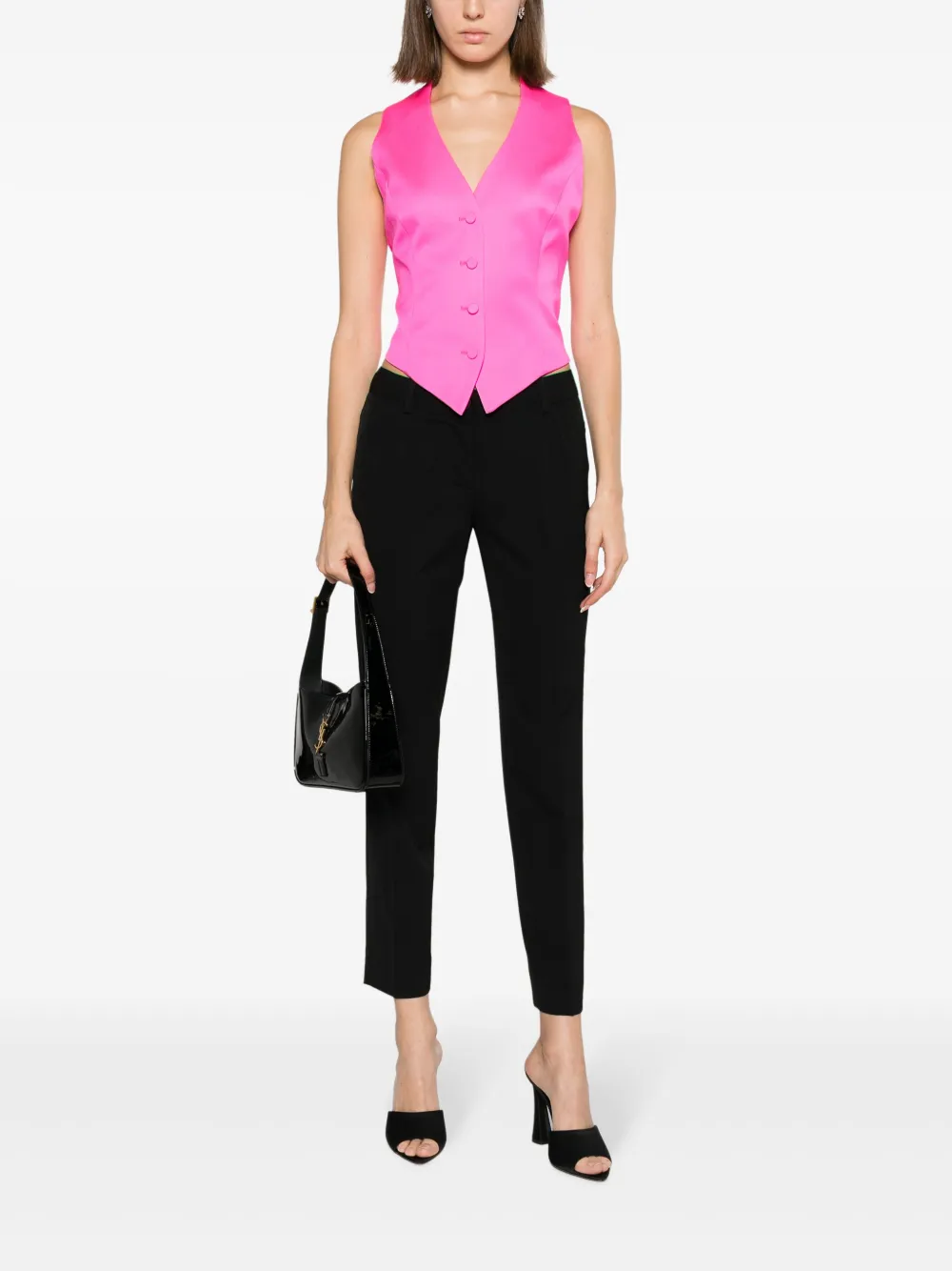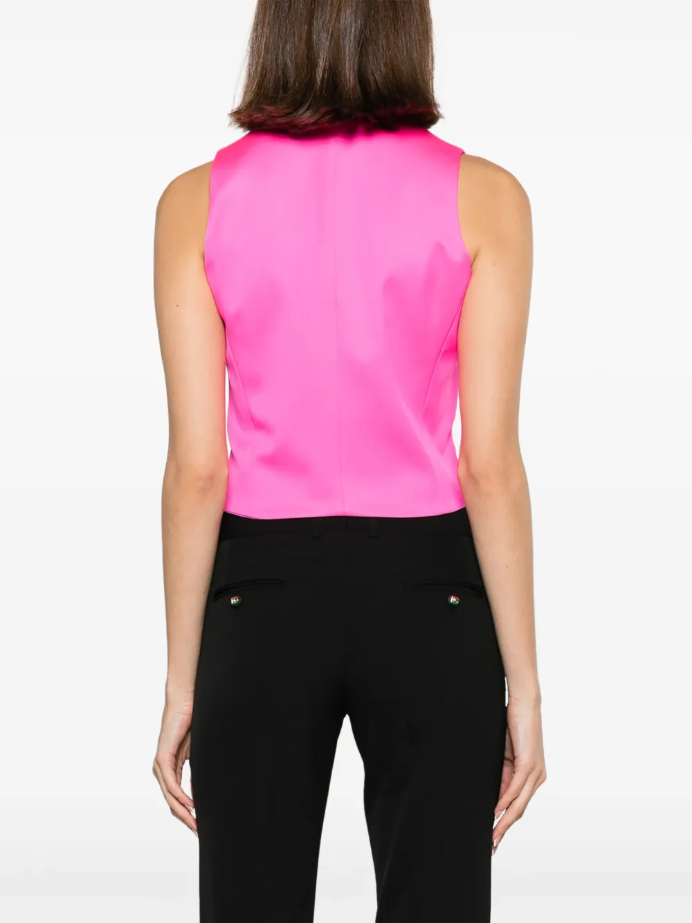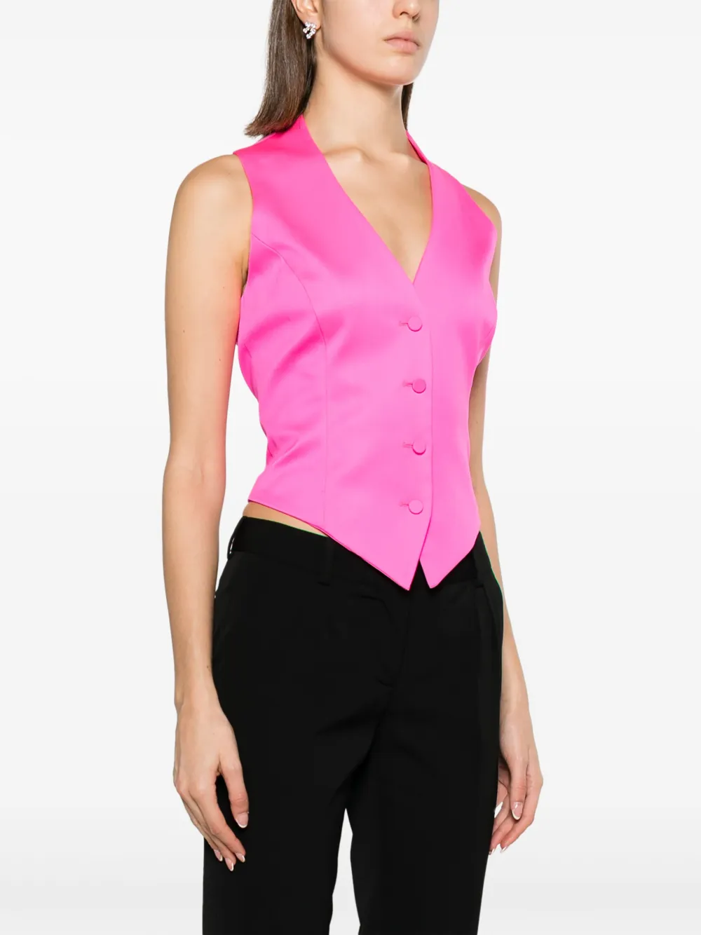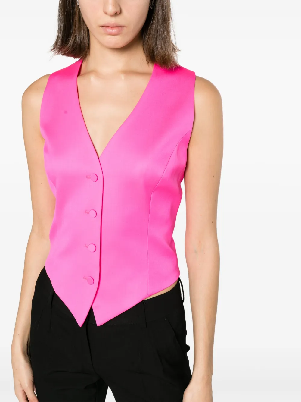 Ярко-розовый, смесовая шерсть, V-образный вырез, застежка на пуговицах спереди, без рукавов и асимметричный подол. Узнать больше о том, какие товары получают отметку «Ответственный выбор», можно из материала «Как мы оцениваем экологичность и этичность».