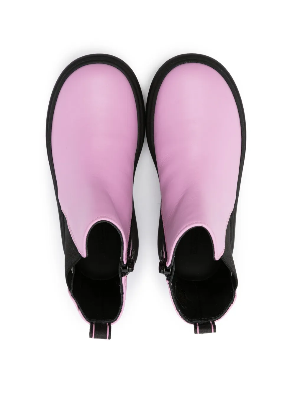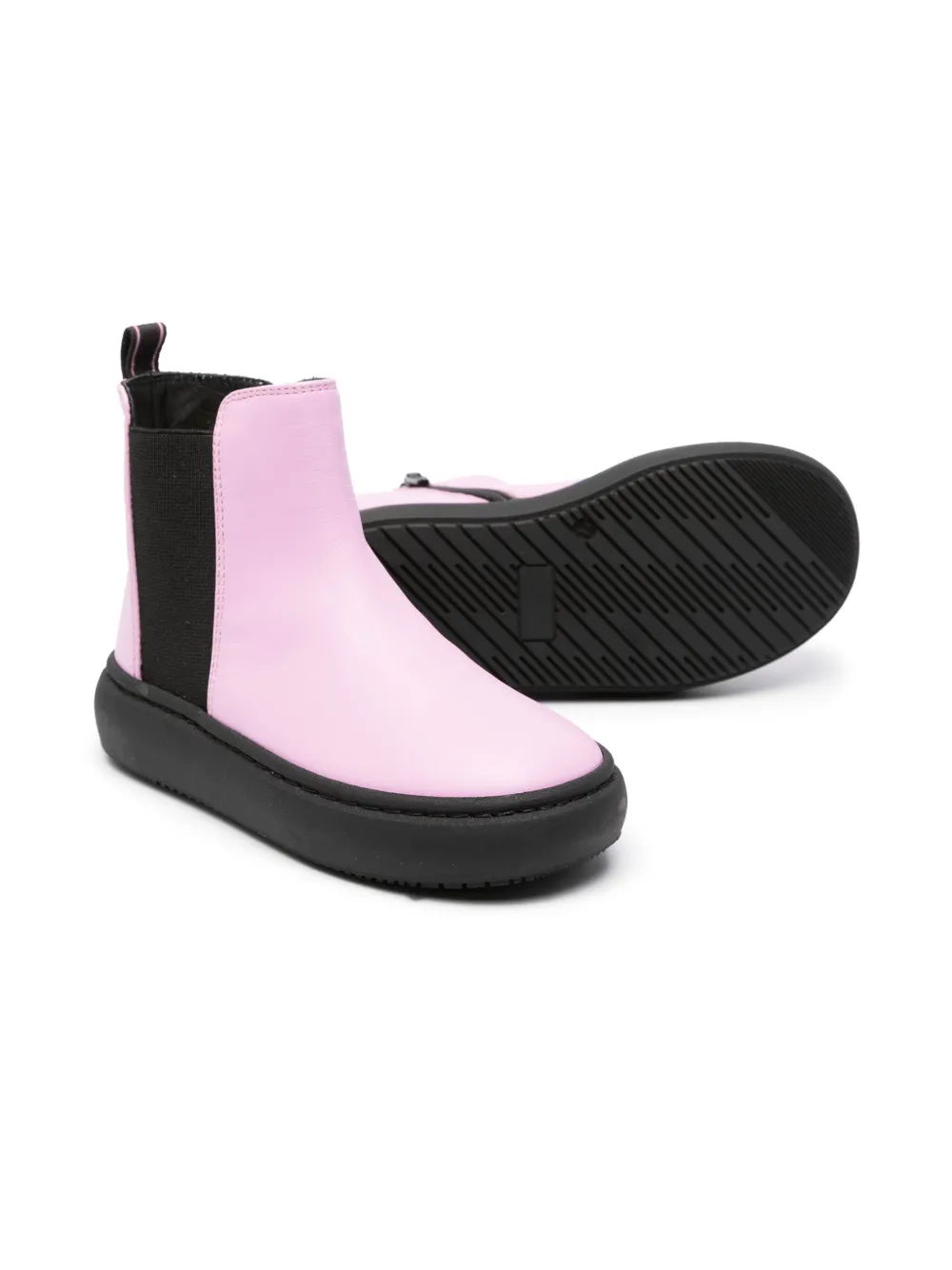 Нежно-розовый, черный, телячья кожа, высота по щиколотку, эластичные боковые вставки, петля для подтягивания сзади, закругленный носок и контрастная резиновая подошва.