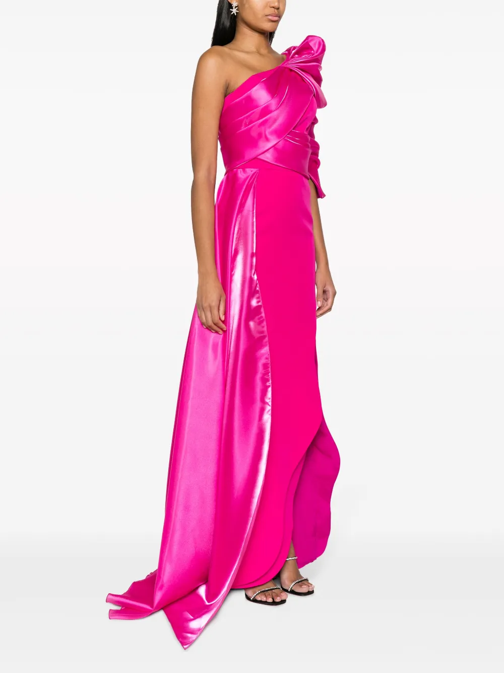 Фуксия, креповая текстура, вставки из органзы, драпировка, асимметричная форма, асимметричный вырез, потайная застежка на молнии сзади, модель на одном плече, один рукав три четверти, асимметричный подол, боковой разрез и длина макси.