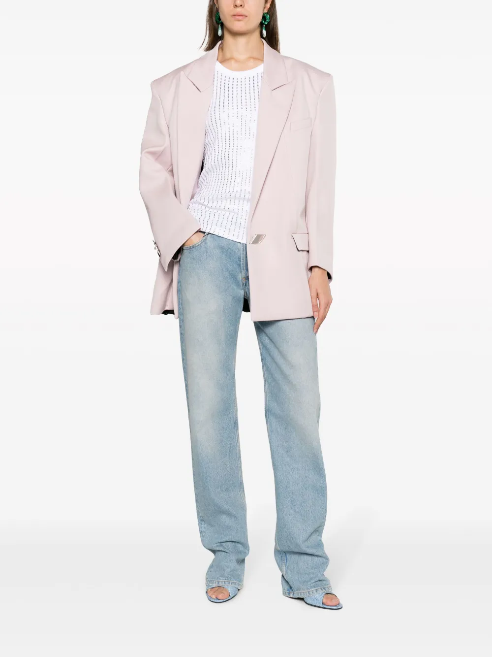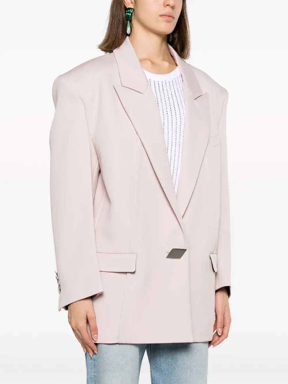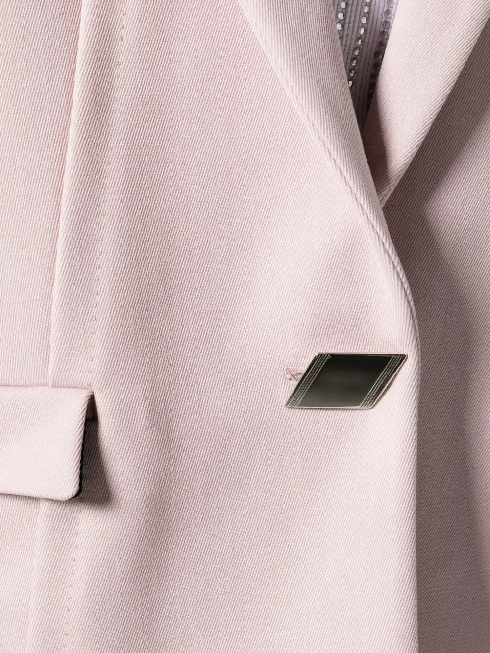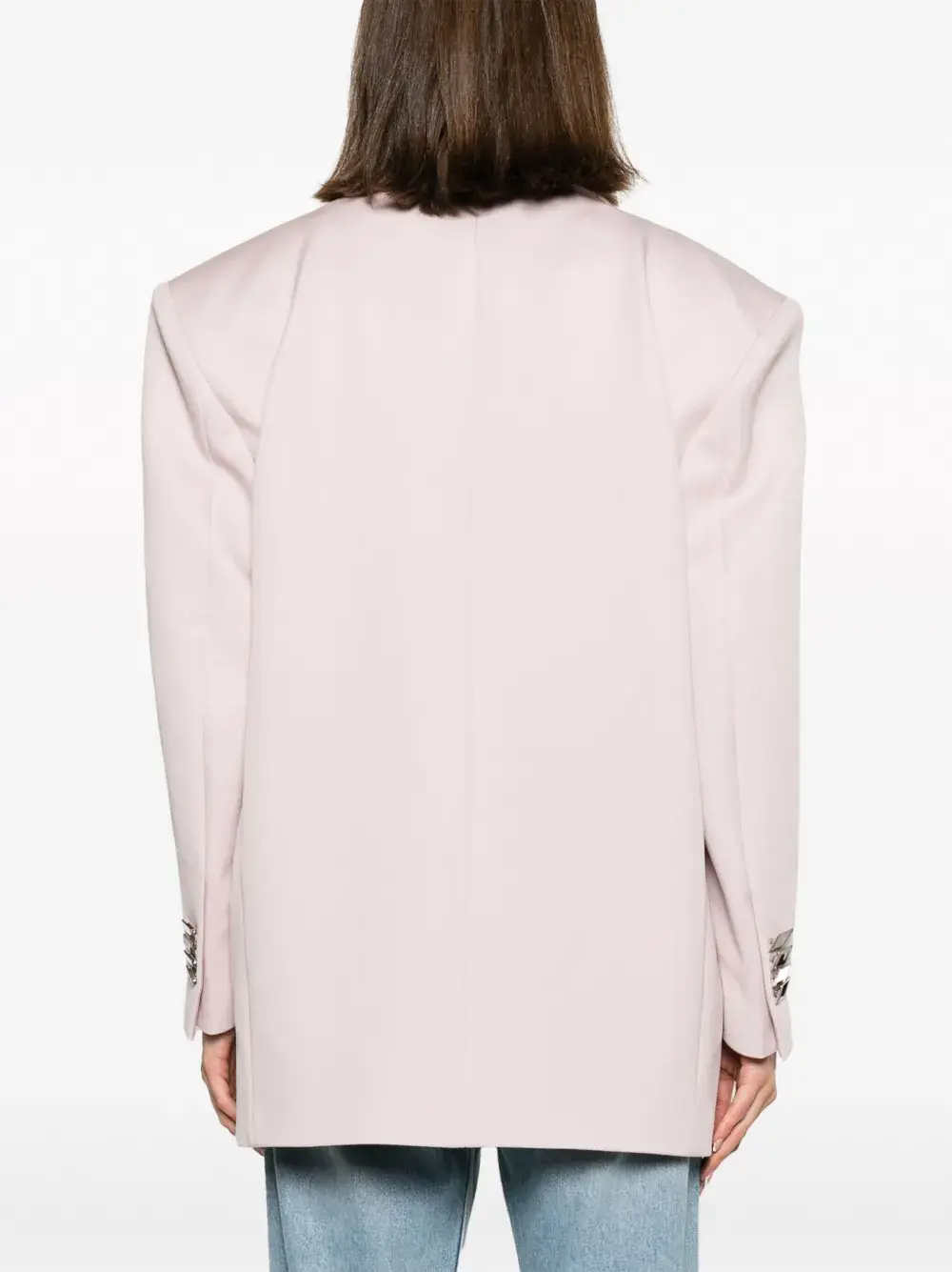 Светло-розовый, смесовая необработанная шерсть, заостренные лацканы, застежка на пуговицах спереди, длинные рукава, прорезной карман на груди, два передних кармана с клапанами, цельная подкладка и прямой подол.