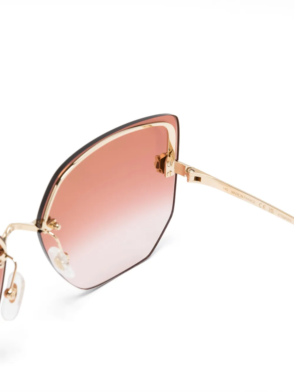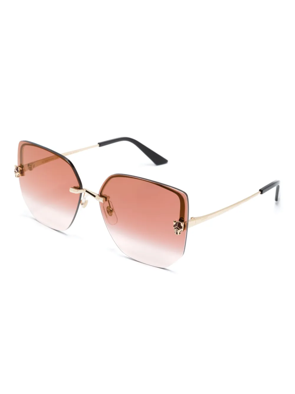 Золотистый, металл, ацетат, розовые линзы, градиентные линзы, знаковая застежка в виде пантеры, оправа «бабочка», носоупоры, прямые дужки и дужки с закругленными концами. В комплект входит защитный чехол для очков.