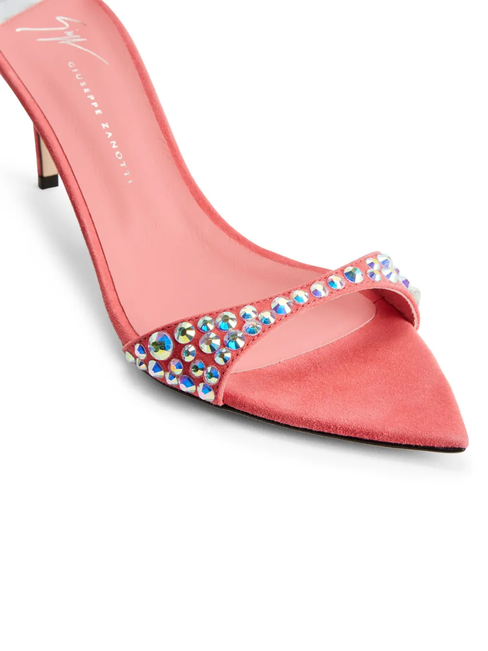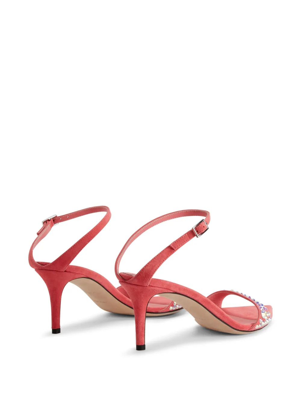 Кораллово-розовый, замша, украшения из горного хрусталя, заостренный носок, открытый носок, ремешок на щиколотке с пряжкой, кожаная стелька с логотипом и каблук средней высоты.