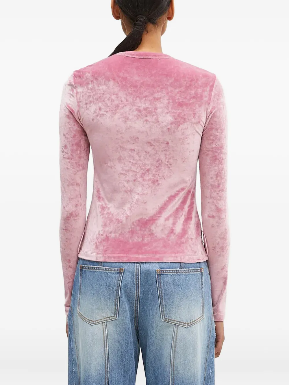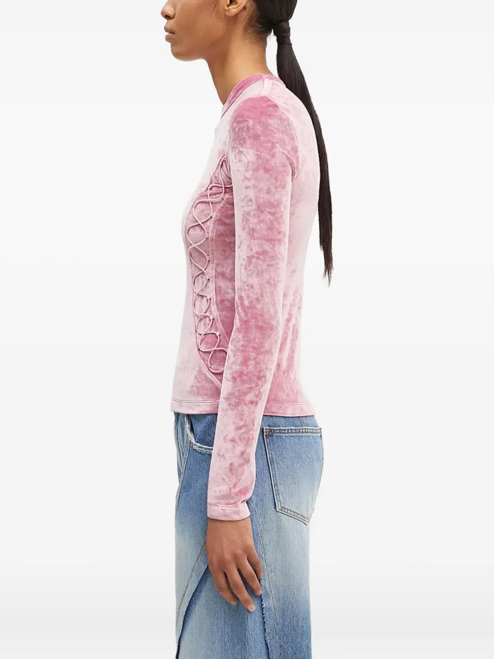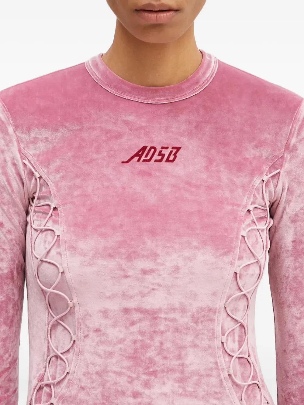 Текстура розового бархата, шнуровка, длинные рукава, круглый вырез, вышитый логотип