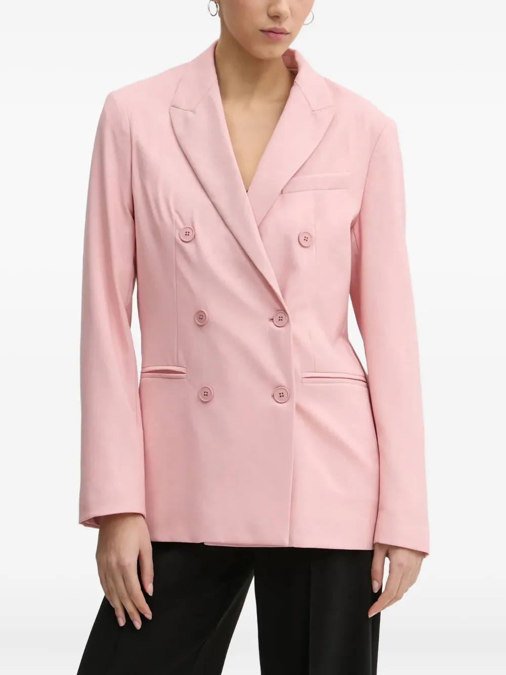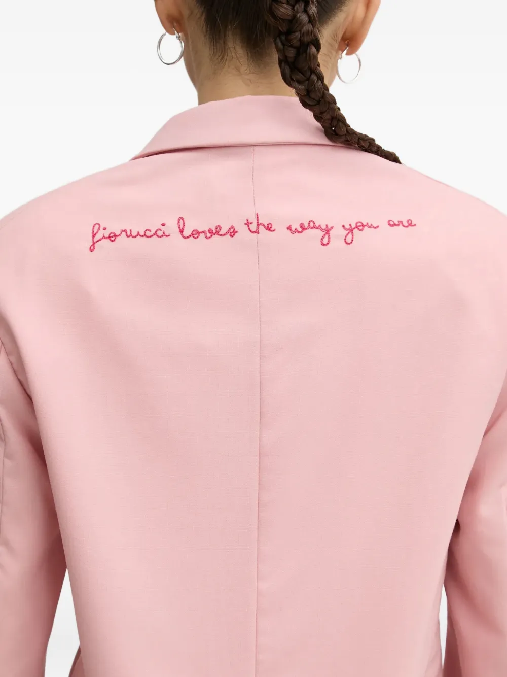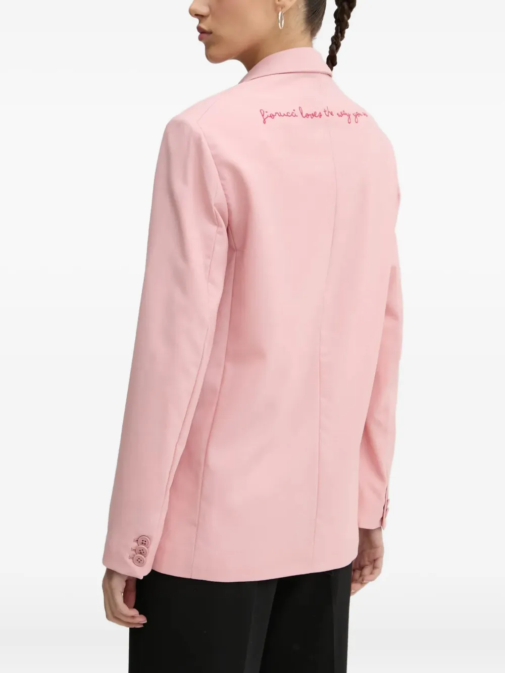 Розовый двубортный пиджак с заостренными лацканами, прорезными карманами, длинными рукавами и вышитой деталью на спине