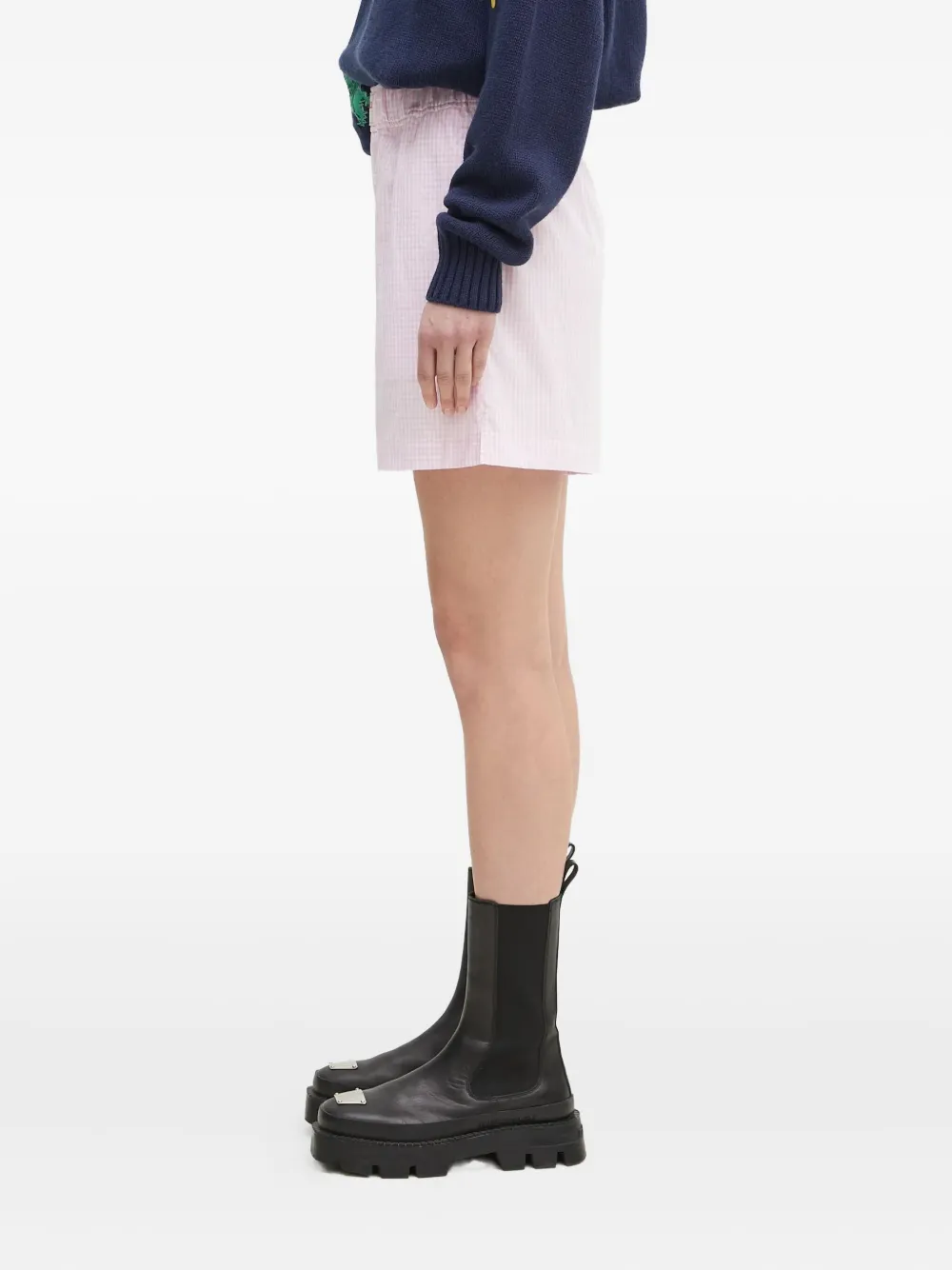 Нежно-розовый клетчатый узор виши, эластичный пояс, застежка на пуговицы, вышитый логотип, задний карман