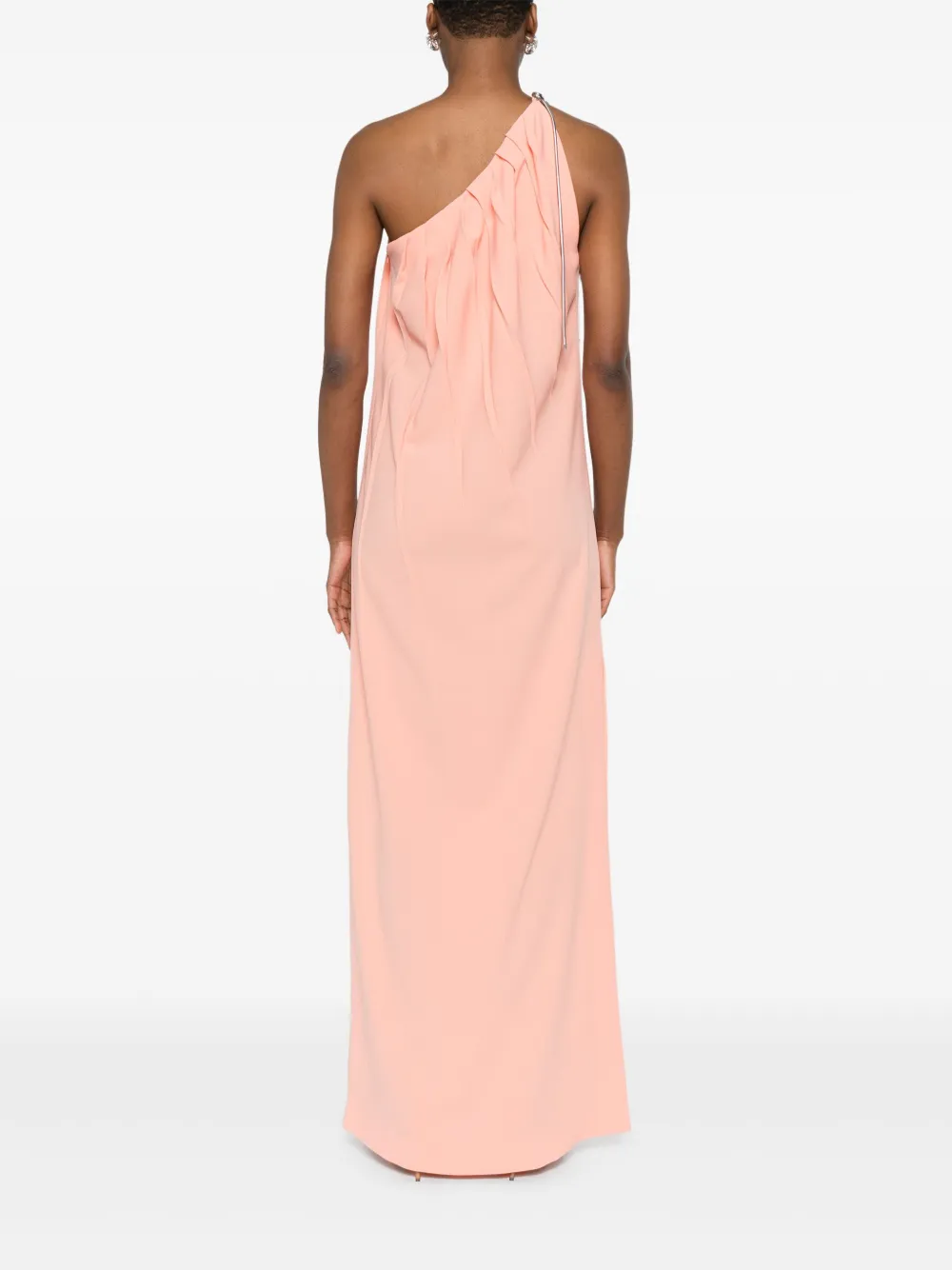 Застежка-молния сбоку нежно-розового цвета, отделка цепочкой, разрез на одном плече сбоку
