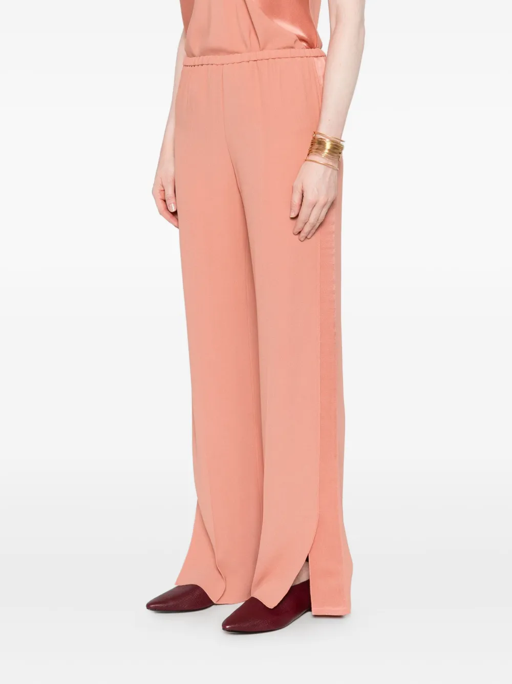 Розовый эластичный пояс, широкие штанины, разрезы по бокам, прямой подол