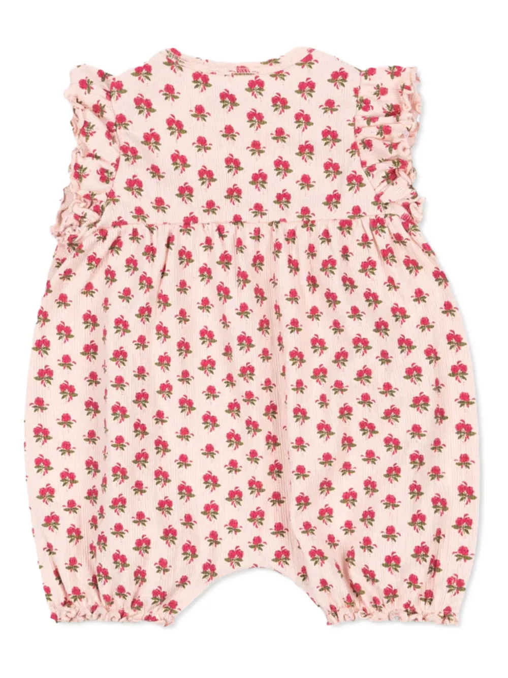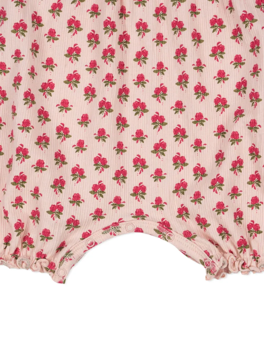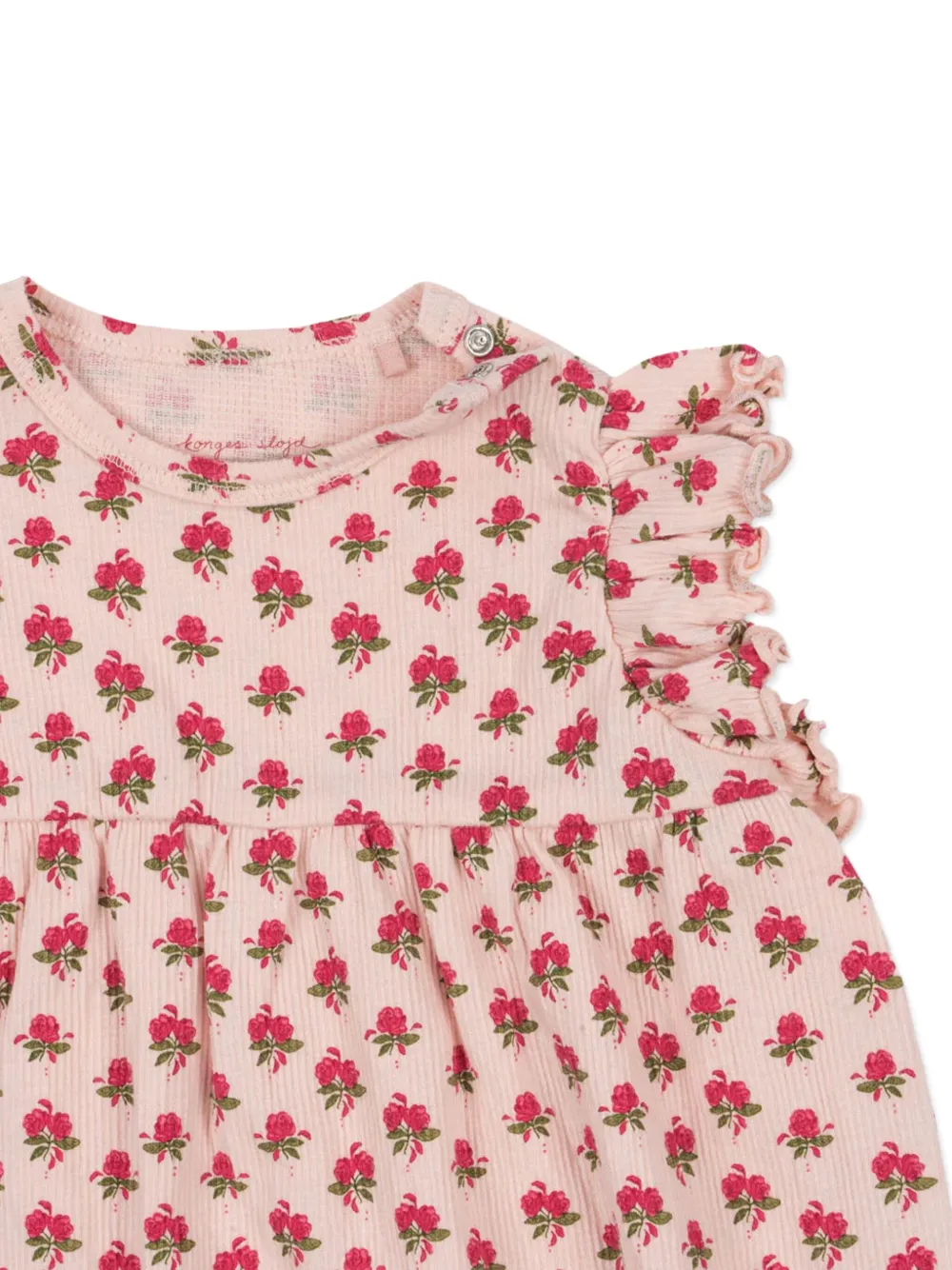 Светло-розовый цветочный рисунок по всей поверхности, оборки на плечах, эластичная талия, сборчатые детали, застежка на кнопки внизу