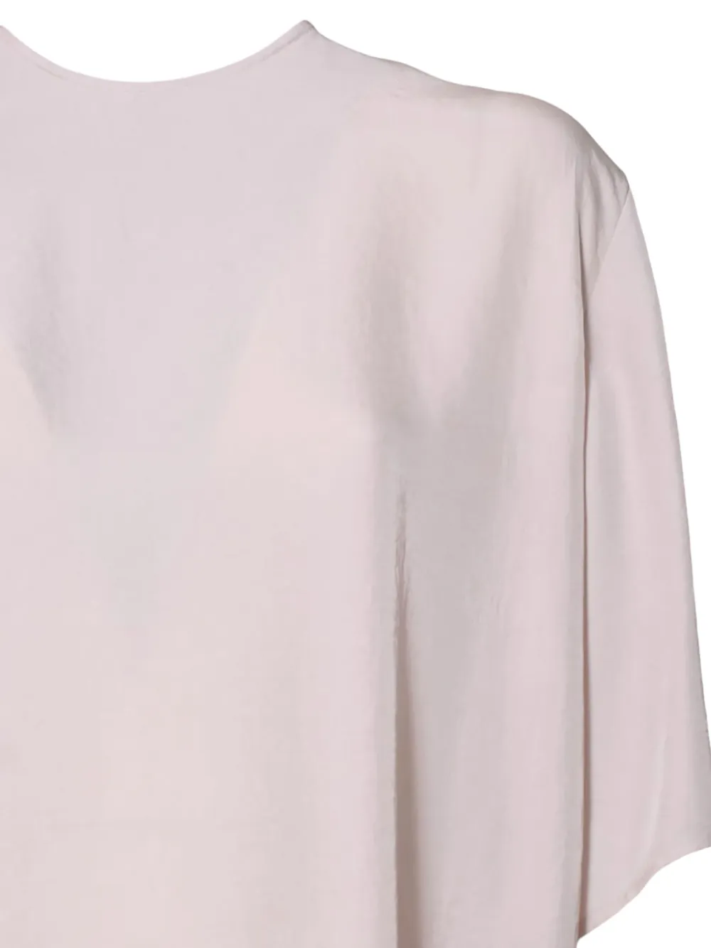 Нежно-розовый, свободный крой, завязывается сзади, рукава три четверти, глубокий вырез на спине