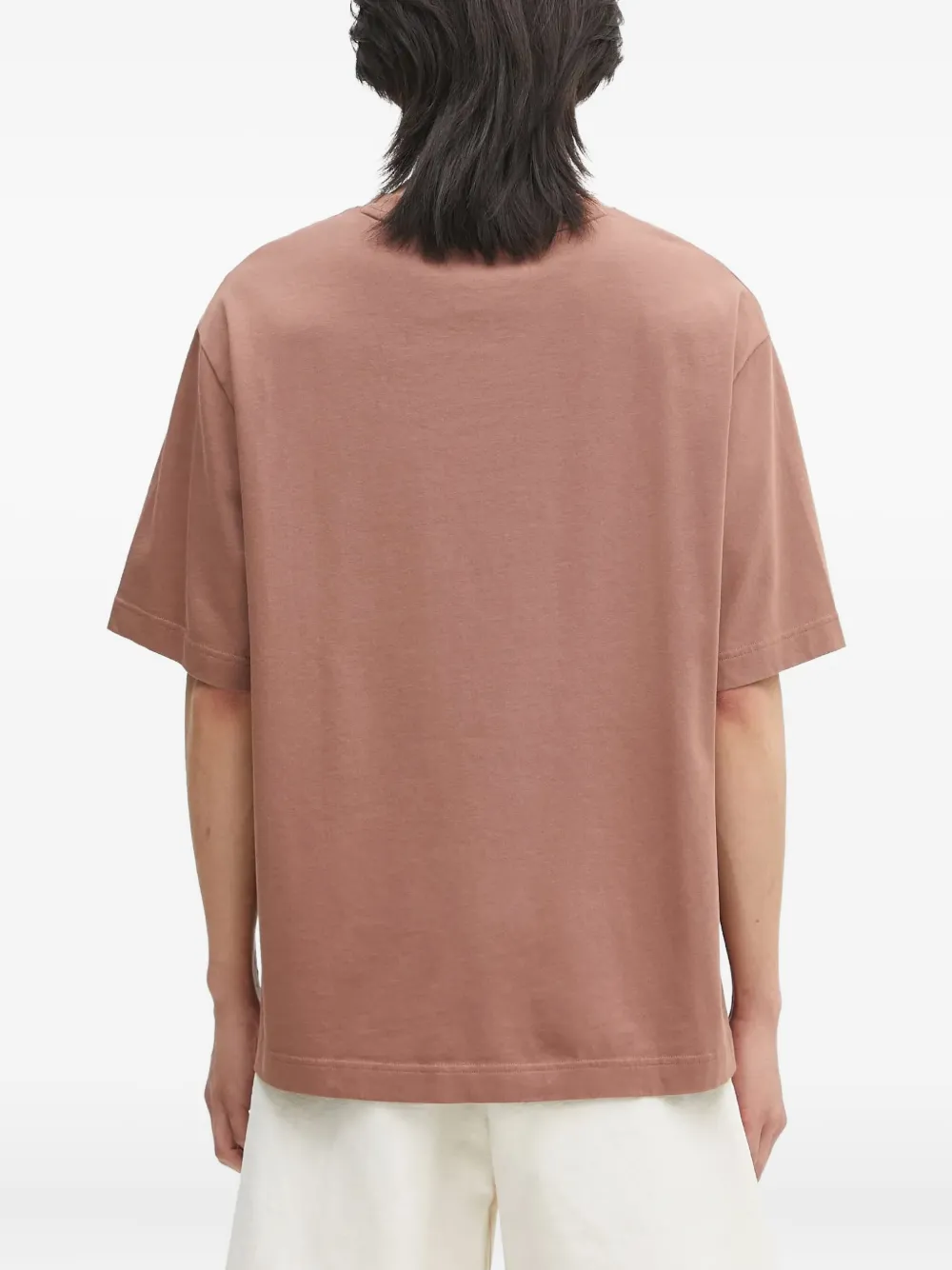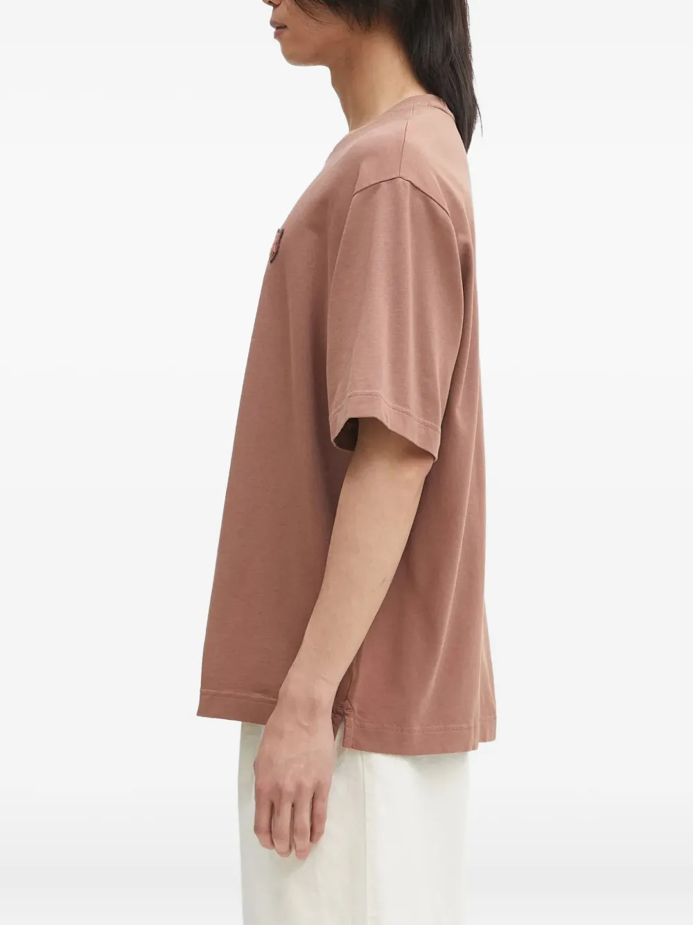Хлопковый трикотаж пыльно-розового цвета с короткими рукавами, круглым вырезом и аппликацией в виде головы лисы