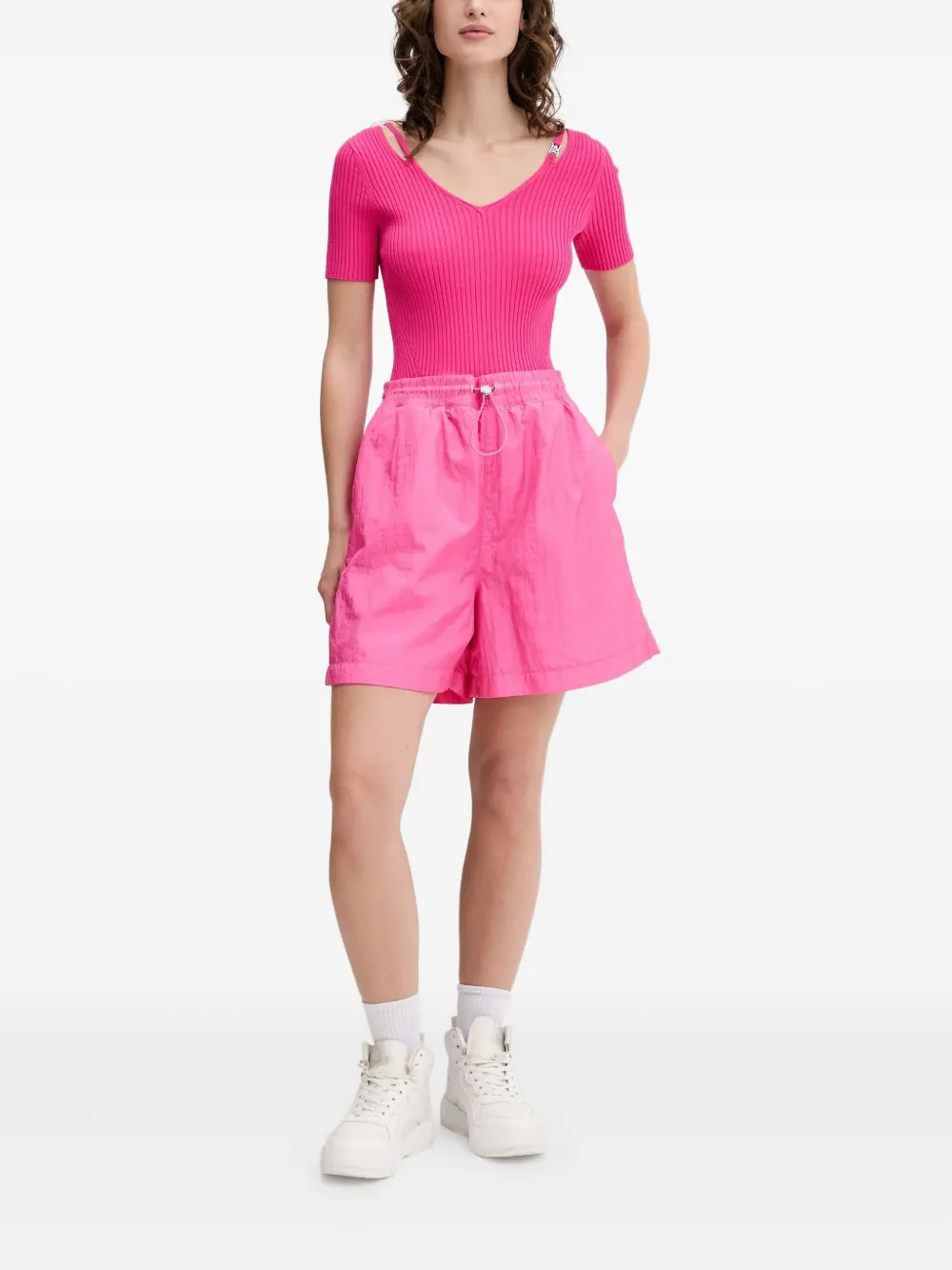 Ярко-розовый, V-образный вырез, короткие рукава, ребристая текстура, металлический логотип, ремешок
