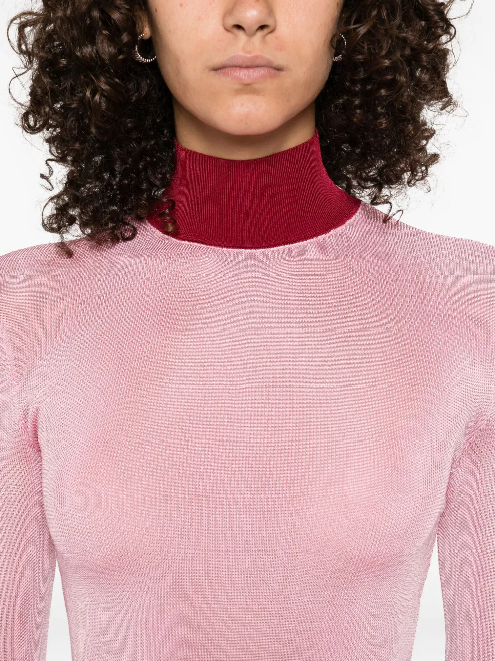 Розовый, с высоким воротом, длинными рукавами, ребристая ткань, прозрачная ткань
