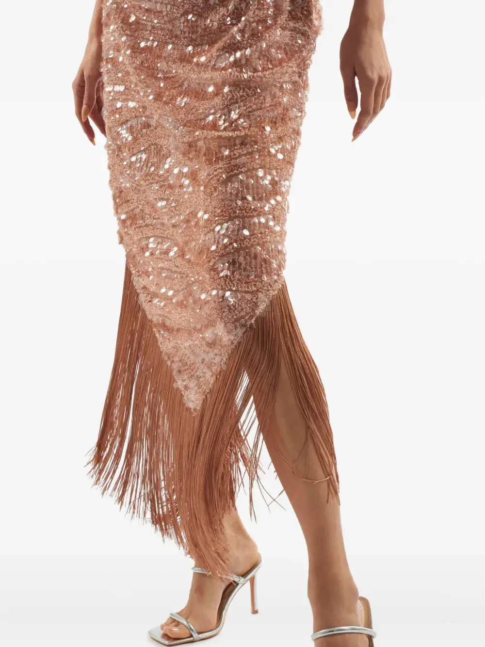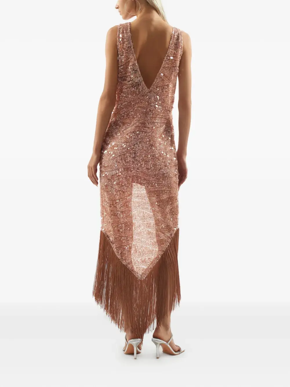Бледно-розовые пайетки, отделка бахромой, без рукавов, круглый вырез, асимметричный подол